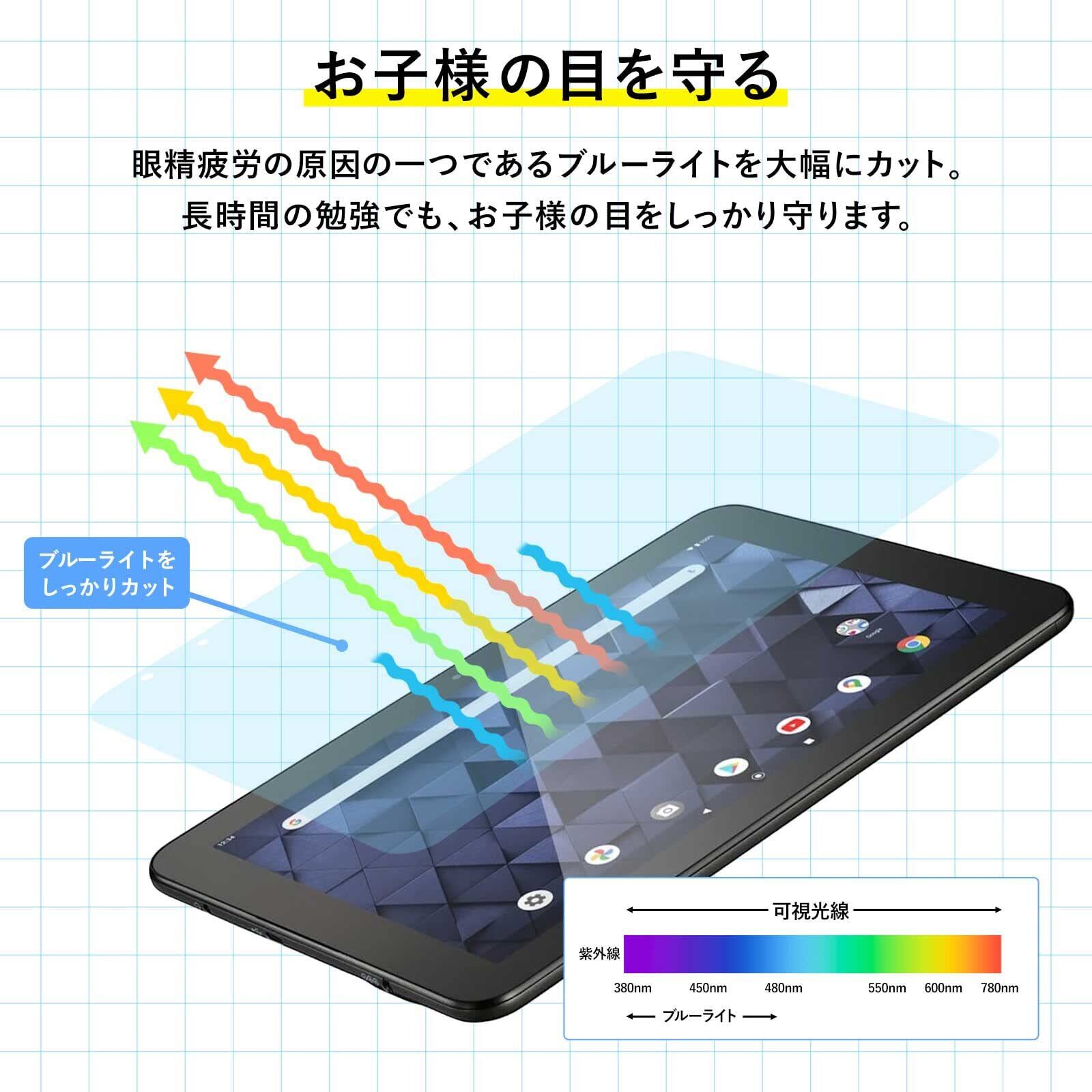 【ブルーライトカット率55%】:お子様の将来のことを考えて設計したブルーライトカット対応フィルム。 ブルーライトの波長だけを約55%低減し、その他の可視光はクリアなまま透過率をキープしています。