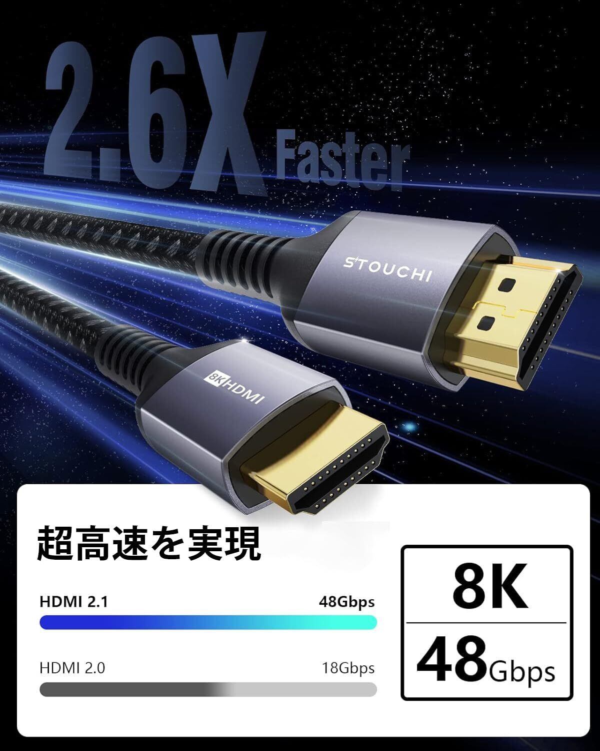 【製品仕様】:最大伝送速度:48Gbps、HDCP: 2.2&2.3、Dynamic HDR:対応、CEC:対応、eARC(エンハンスド・オーディオリターンチャンネル):対応、EHAC(HDMIイーサネットチャンネル):対応、ケーブル方向性:なし、最大解像度:8K@60Hz。Stouchiは、ウルトラハイスピードHDMI認証ケーブルを用途に合わせて各種の長さを取り揃えておりますので、ご安心してお買い求めください。