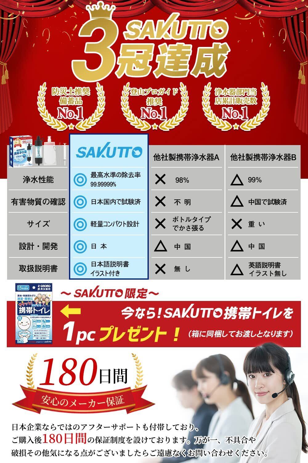 【日本企業が企画・開発・管理】最高水準の除去率99.99999%を国内の水質検査機関にて実証しているSAKUTTO 携帯ろ過器は、日本企業が企画・開発・管理を行っており、商品ひとつひとつに丁寧な管理、検査を徹底して行なっております。さらに日本語説明書・書も付属しており、日本企業ならではの180日間の制度も付帯しておりますので、ご安心してお試しくださいませ。