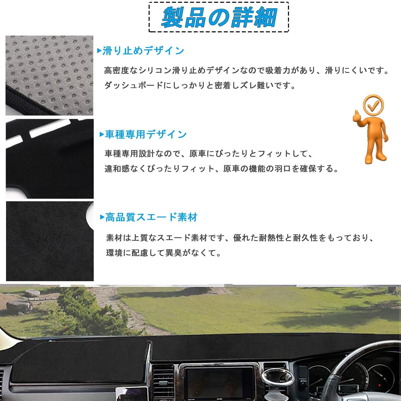 【上質な材料】ハイエース ダッシュボードマットの素材は上質なスエード素材です、優れた吸熱能力を持っています。材質は丈夫で、変形しにくいです。また、裏面は高密度なシリコン滑り止めデザインなので吸着力があり、ズレたりしません。予備のマジックテープも付きますので、ダッシュボードに置いて位置を調整して初心者でも簡単に取り付けできます。