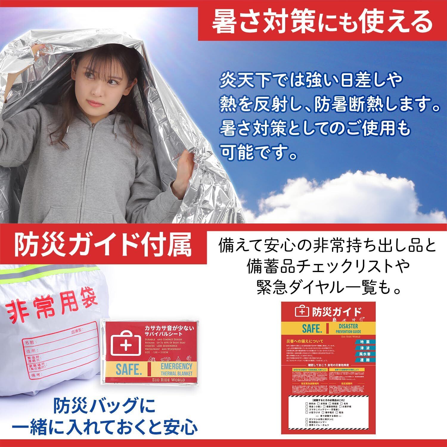 Eco Ride World アルミシート エマージェンシーシート カサカサ音が少ない 静音 ブランケット アルミブランケット サバイバルシート 備蓄 防災 保温 (5) sb_126-03