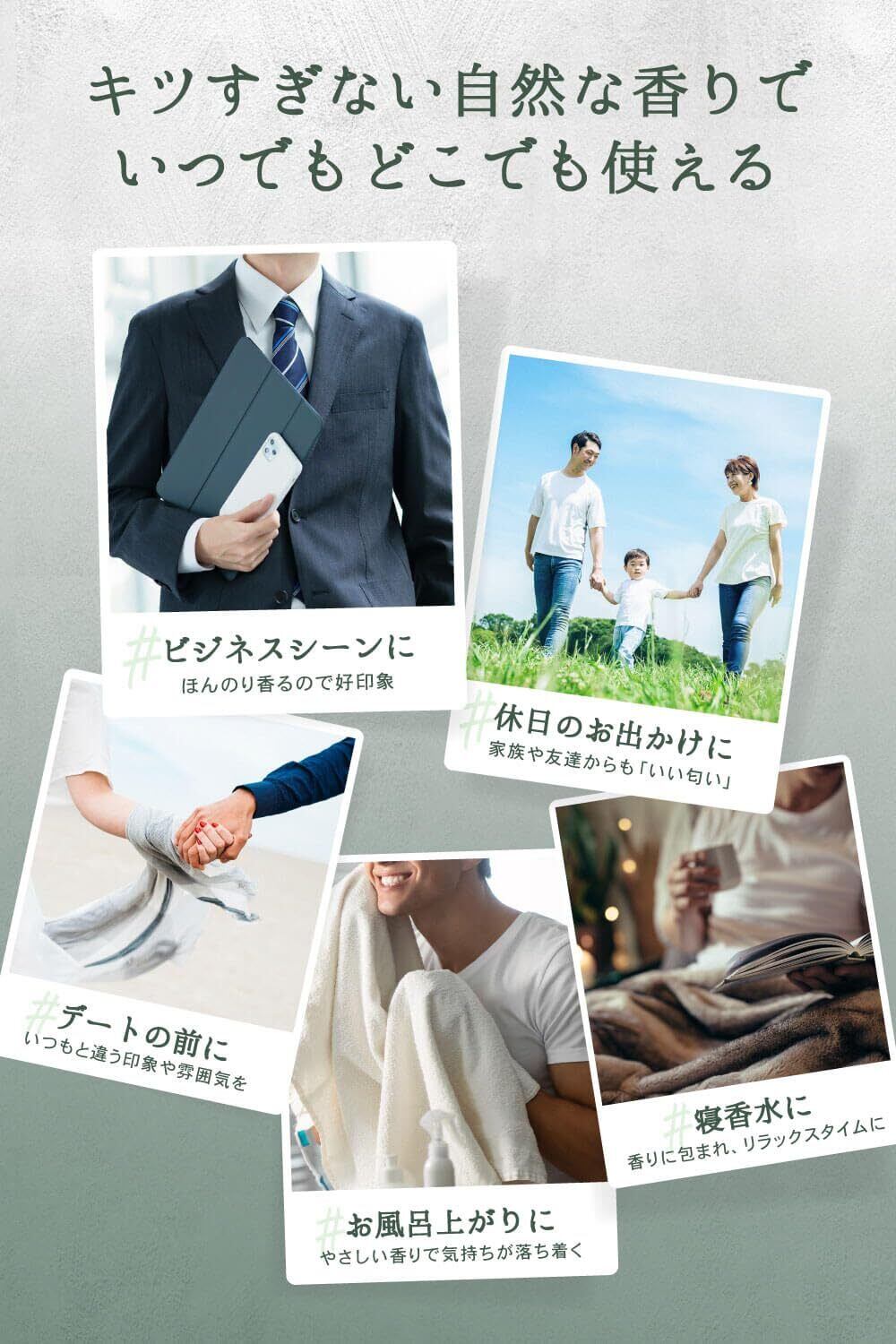 【上品で爽やかなグリーンティーの香り】■日本のグリーンティーを基調とした爽やかで上品な、どこか懐かしく雰囲気のある深い香り。男女問わず使える爽やかな香りが人気。■男性だけでなく女性からも高評価で、ビジネスシーンや家族とのお出かけ、就寝前の寝香水としてもおすすめ。ほのかに香る爽やかな香りが癒しの時間をお届けします。
