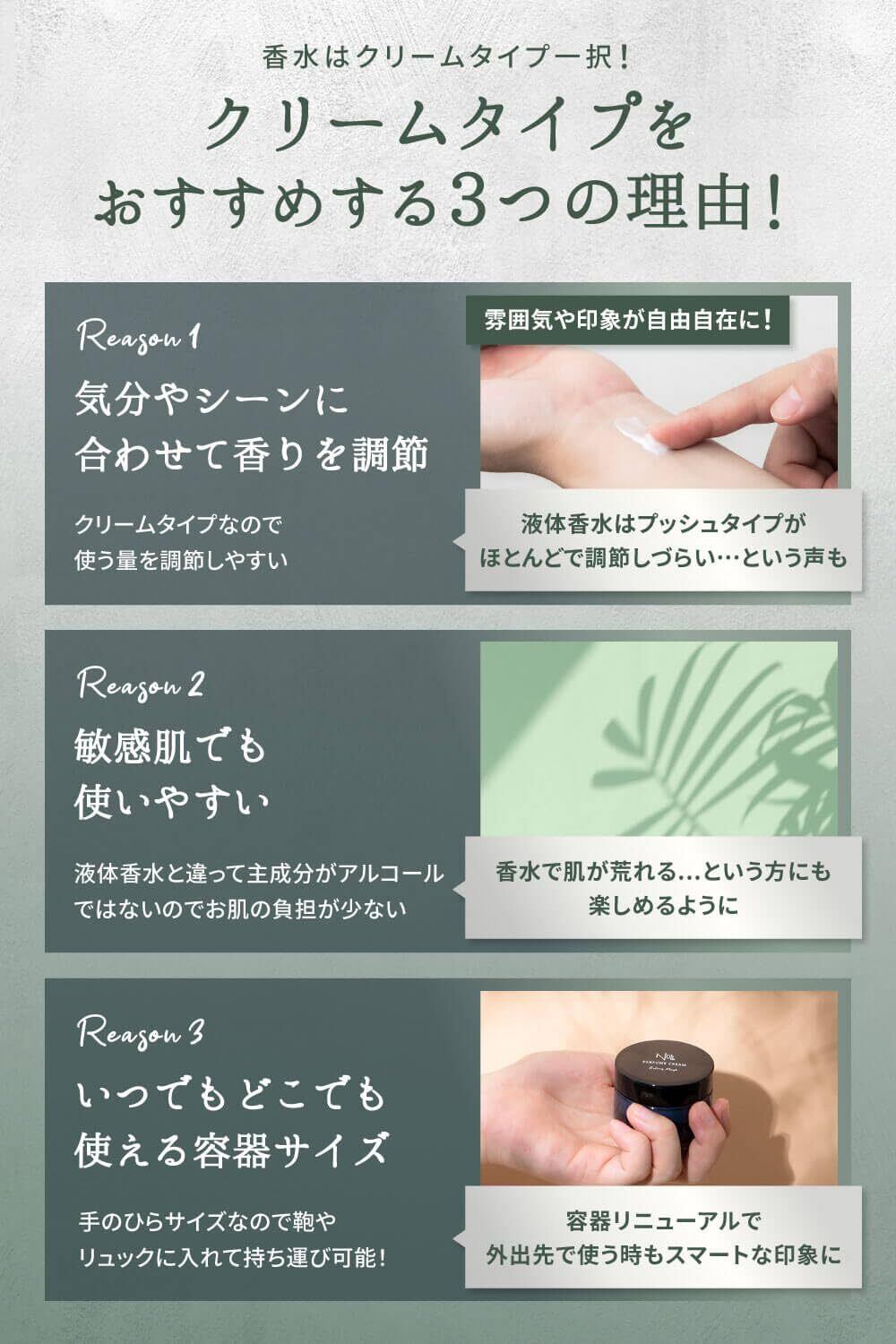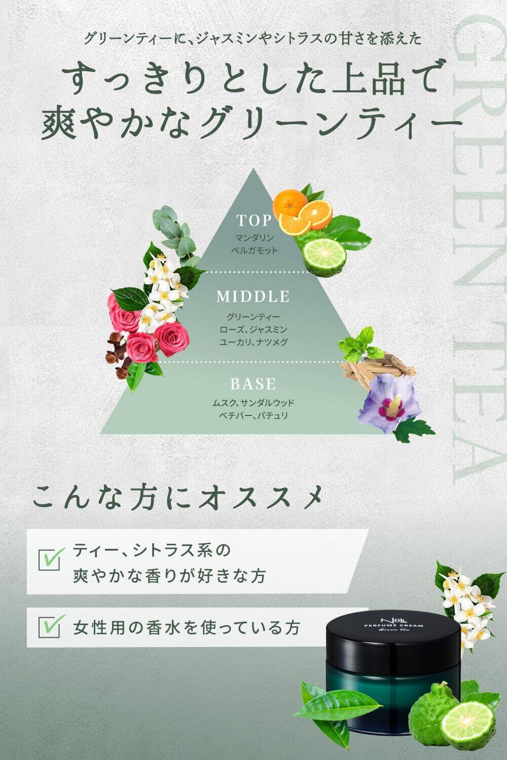 【こんな方におすすめ】香水が好きな方 キツイ香りが苦手な方 初めて香水を使う方 敏感肌 男性 女性 メンズ レディース 【こんなシーンにも】出勤前 ビジネスシーン 商談前 打ち合わせ お出かけ デート 就寝前 お風呂上がり【製品名】NULL パヒュームクリーム グリーンティー 【フレグランス】マンダリン ベルガモット グリーンティー ローズ ジャスミン ユーカリ ナツメグ ムスク サンダルウッド ベチバー パチュリ 【分類】化粧品【使用部位】首筋、手首、耳の後ろ、髪、胸元、足首など