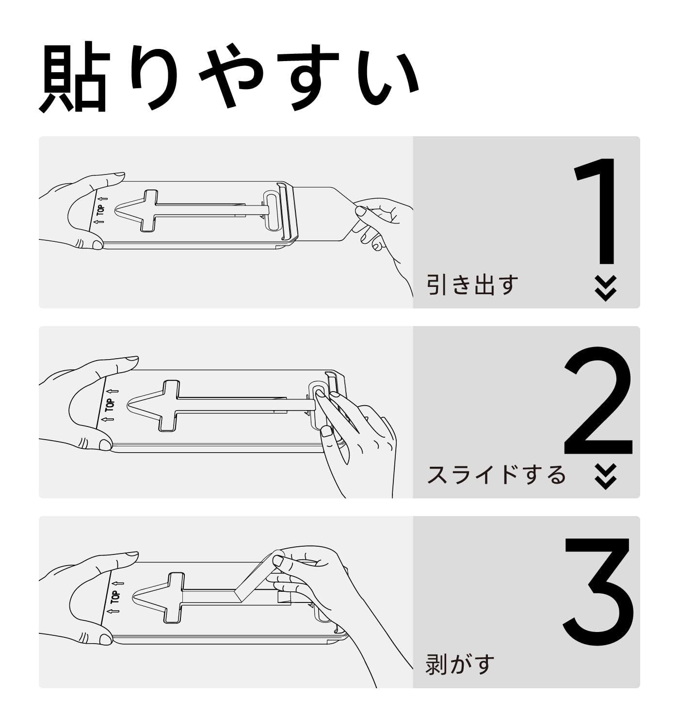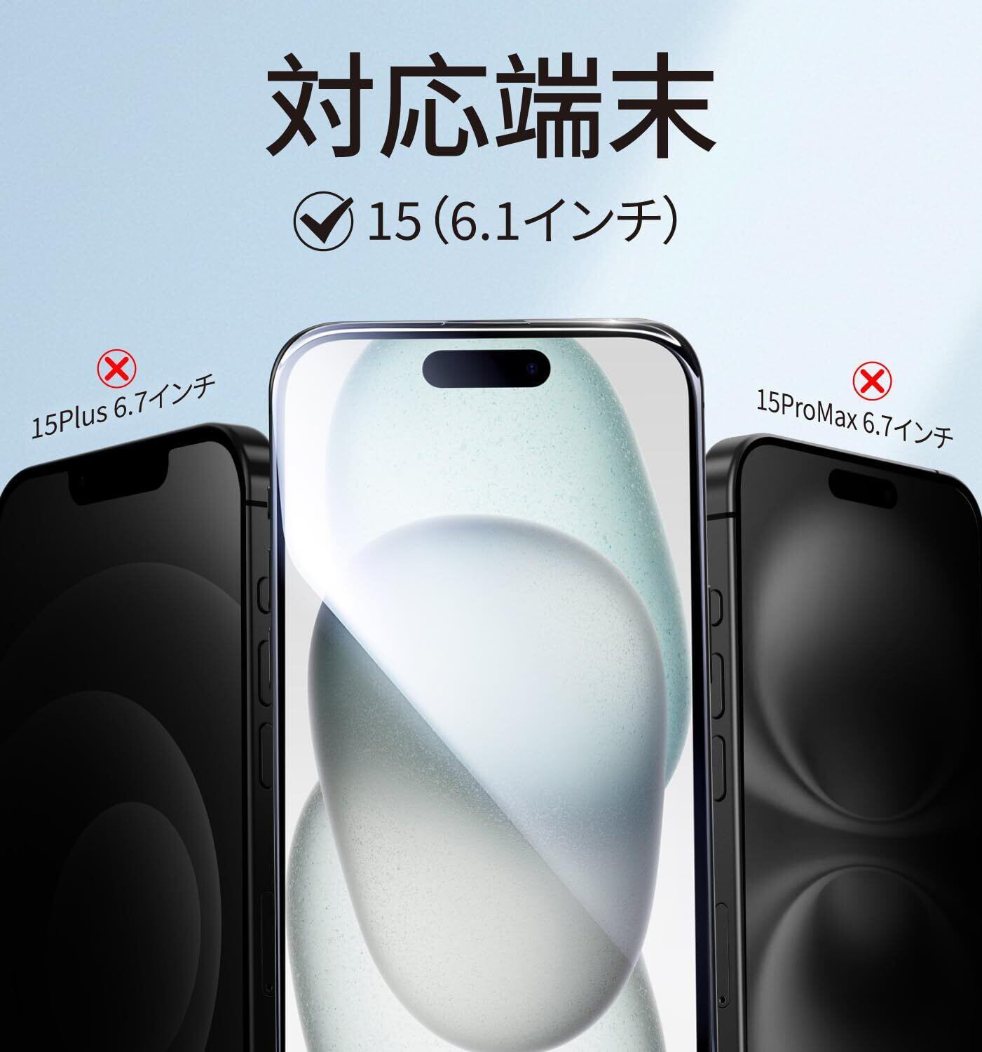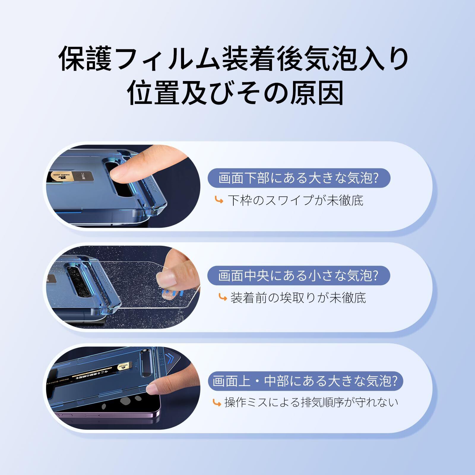 【もう失敗はしない】本製品はiPhone15に対応するガラスフィルム2枚セットです。百万以上の欧米ユーザーのフィドバックを集めて日々改善したガイド枠は、3歩だけで保護フィルムを貼り付けます。そのうえ、自動ホコリ取りデザインだけでなく、ガイド枠のスロープデザインで、空気を順序に取り除くことができて、初心者でも気泡レスのまま綺麗に貼れます。