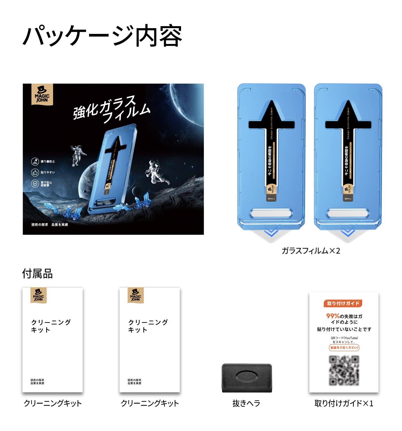 【MAGIC JOHN】当店をご利用いただくことにより、30日間返品返金サービス、90日間無料交換サービス、光沢タイプのガラスフィルム2枚、ツールパッケージ2個、説明書1本などもらえます。お客様がより便利にフィルムを貼り付けるよう、より安心できて買えるよう、MAGIC JOHNは日々努めて参ります。