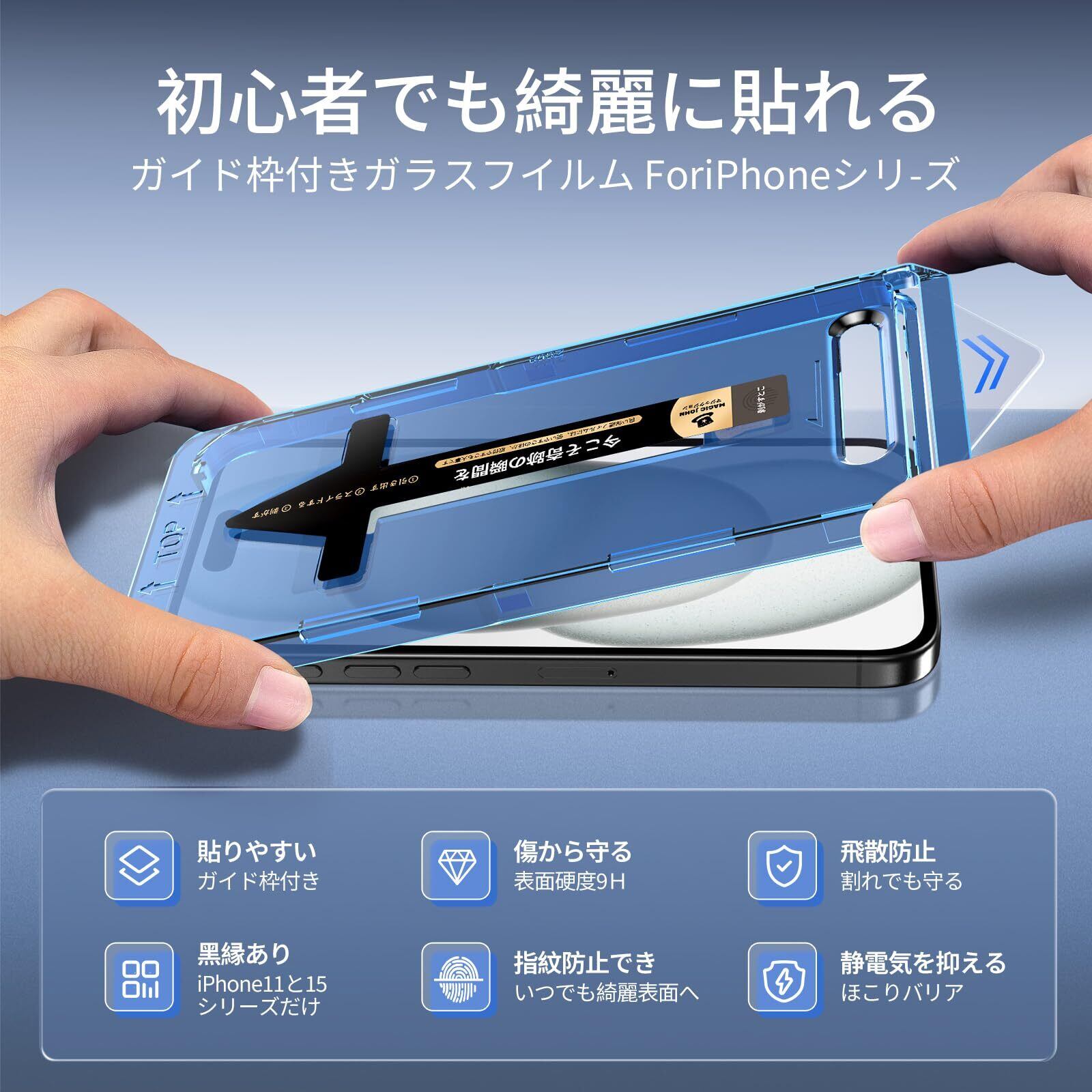 【光沢仕様】MAGIC JOHN iPhone 15 ガラスフィルム 2枚セット ガイド枠付き 自動吸着 貼りやすい iPhone15 フィルム 指紋防止 飛散防止 アイフォン15 保護フィルム スクラッチ防止 黒縁あり | hananoki