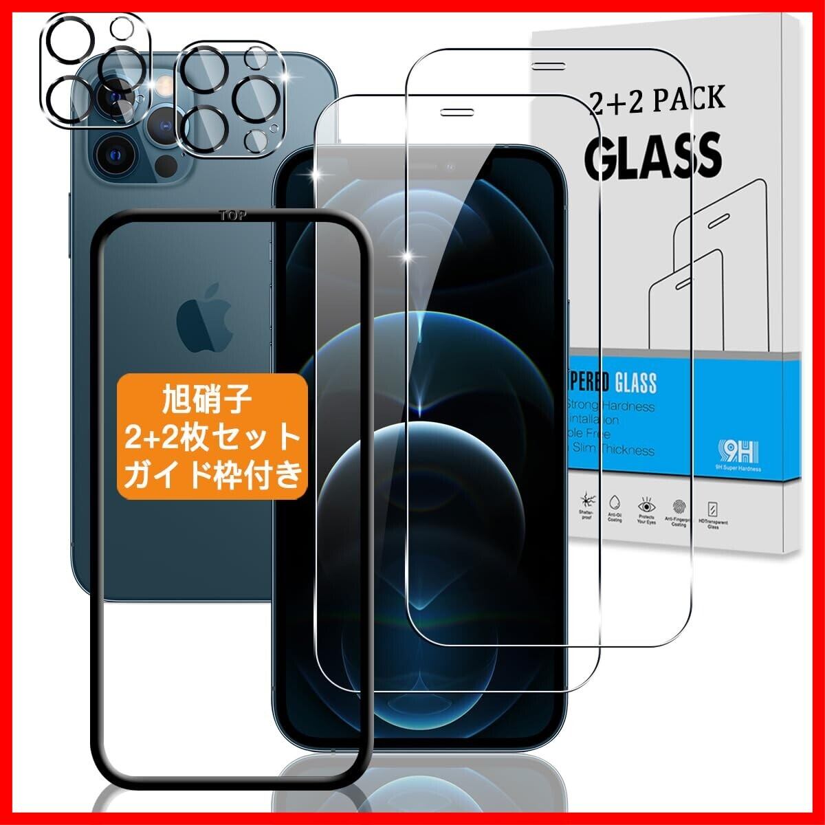 【2+2枚セット ガイド枠付き】 対応 iPhone 12 Pro Max ガラスフィルム + カメラフィルム 【日本旭硝子 硬度9H】 対応 アイフォン12 Pro Max フィルム 強化ガラス 液晶 保護フィルム 3D Touch対応 、高透過率 、気泡ゼロ 、厚さ0.26mm超薄型 、飛散防止 、高感度 、衝撃吸収 、指紋防止 、ラウンドエッジ加工 、簡単貼り付け