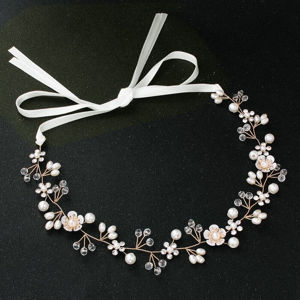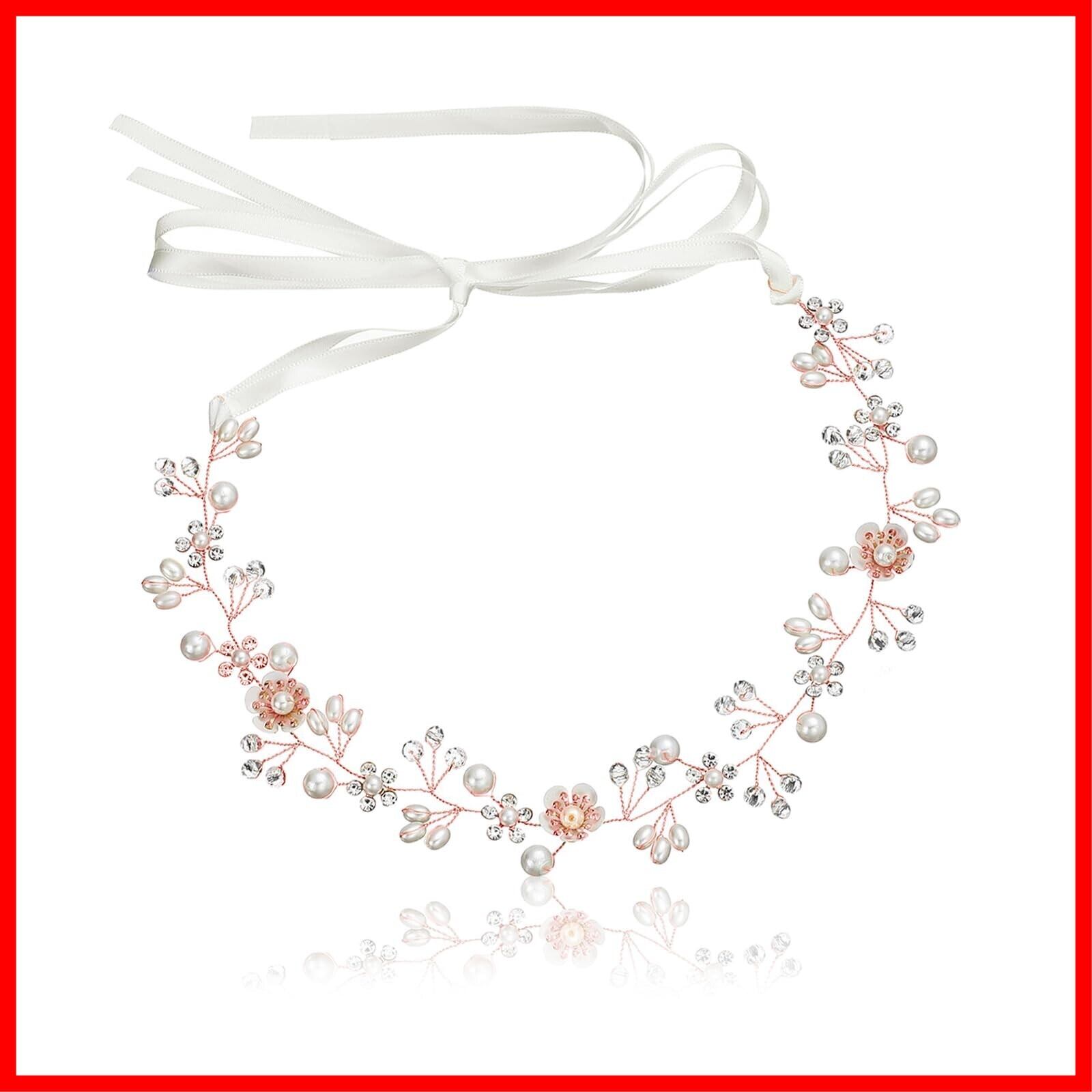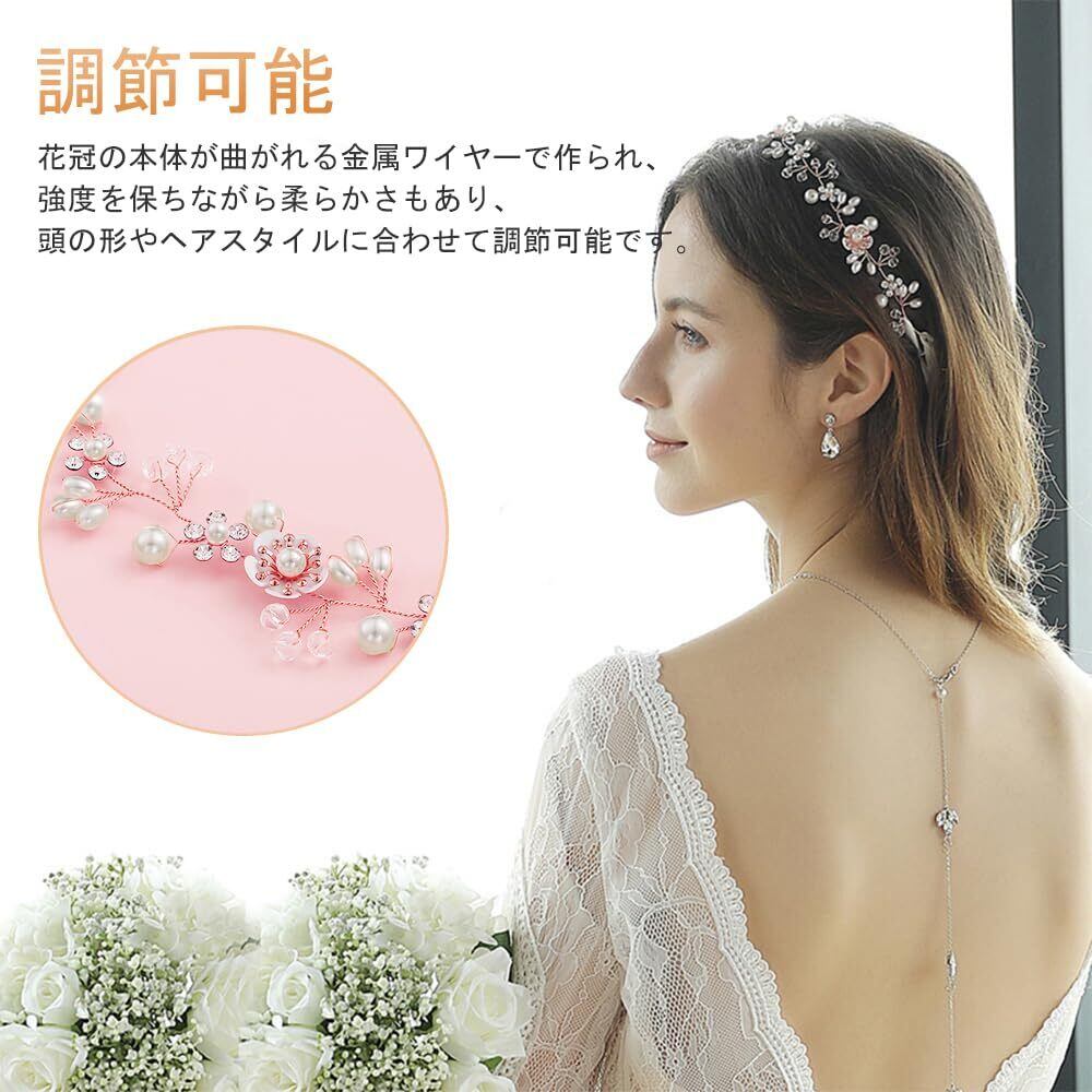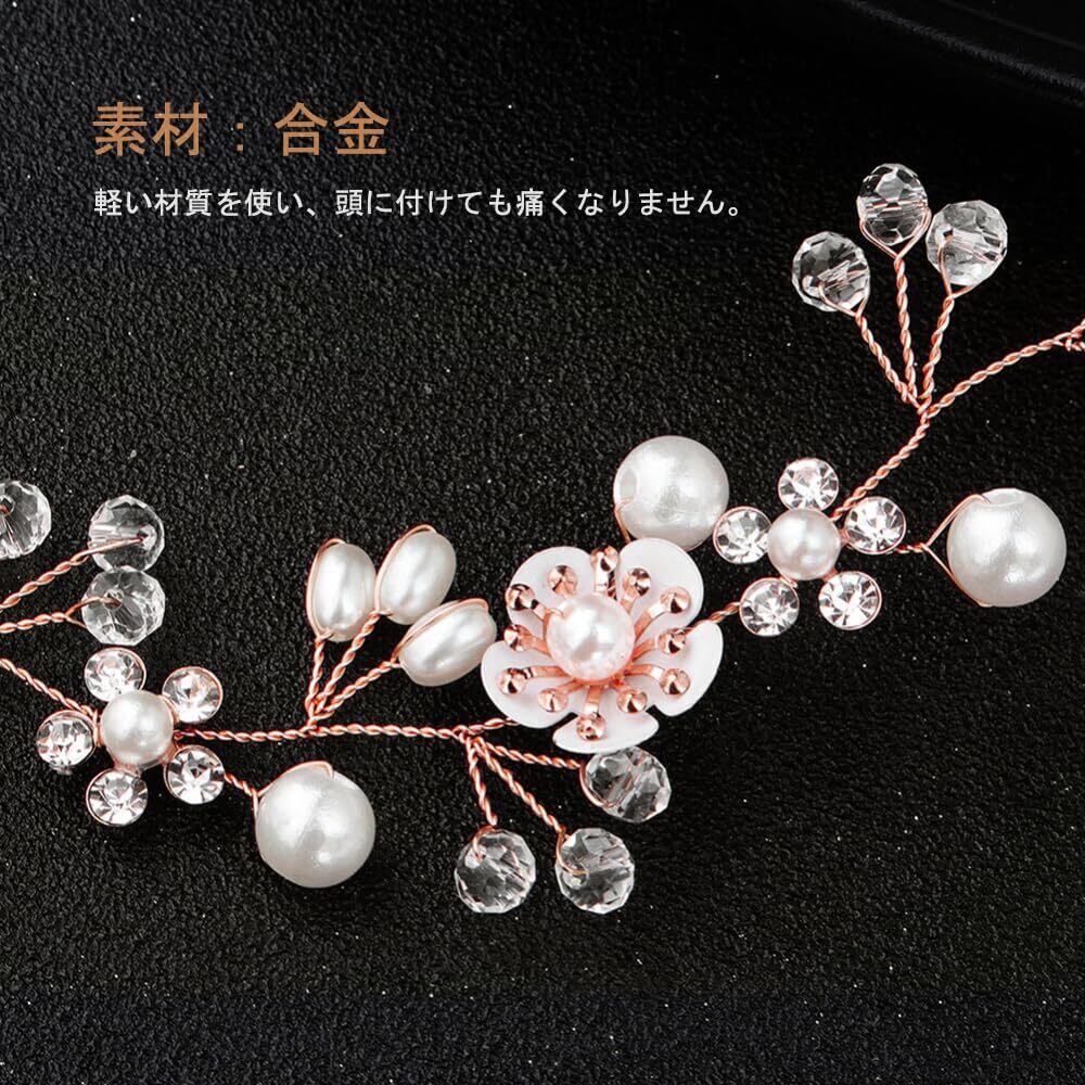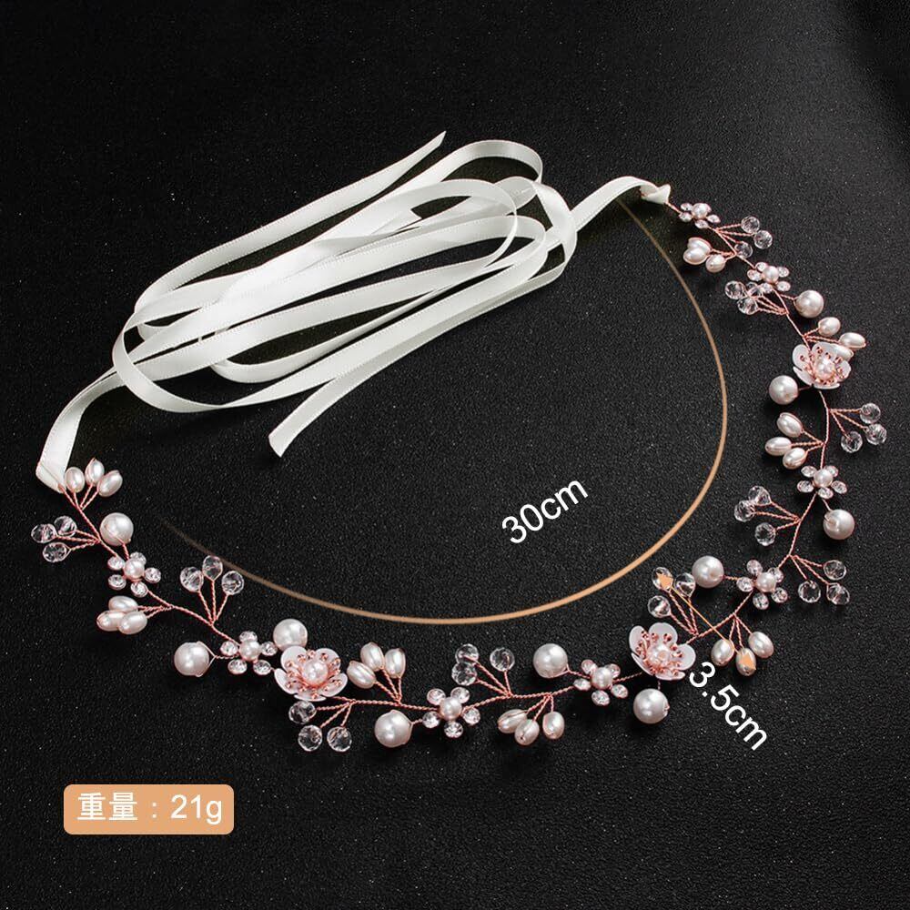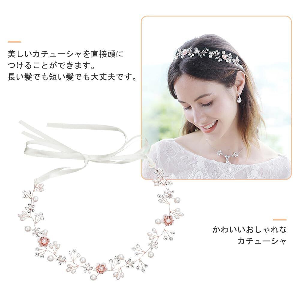 サムコス 髪飾り 花 パール 花かんむり リボン ホワイト ヘッドドレス クリスタルビーズ 花冠 ヘアアクセサリー 結婚式 発表会 披露宴 卒業式 パーティー ダンス 和装 撮影 写真 子供 大人用 (A,ローズゴールド)