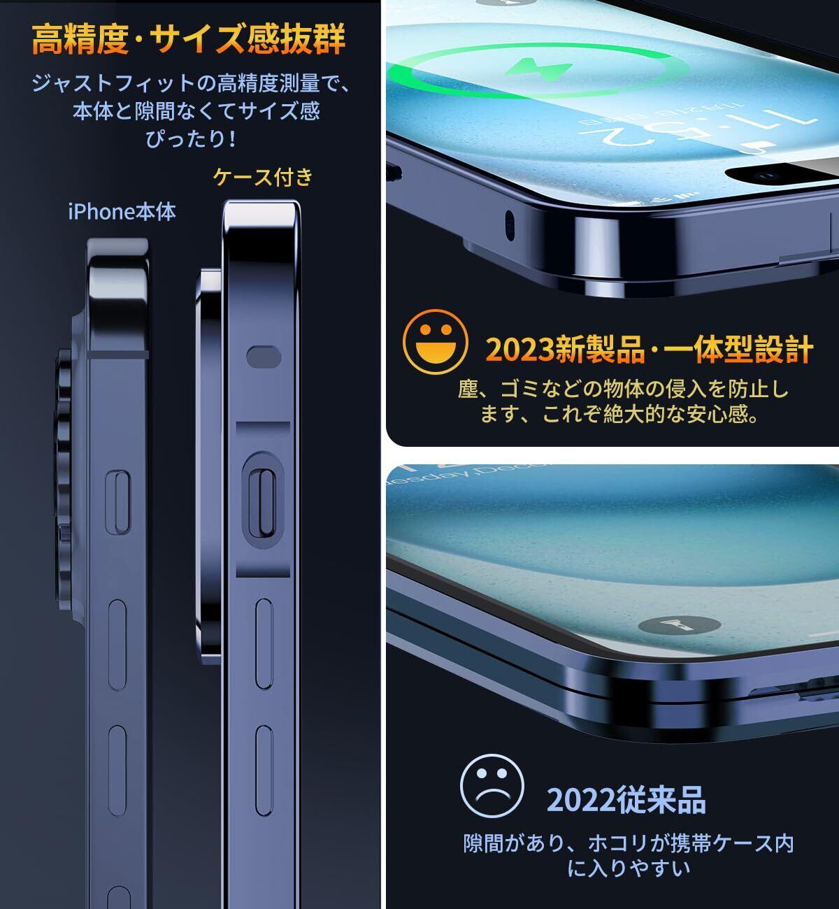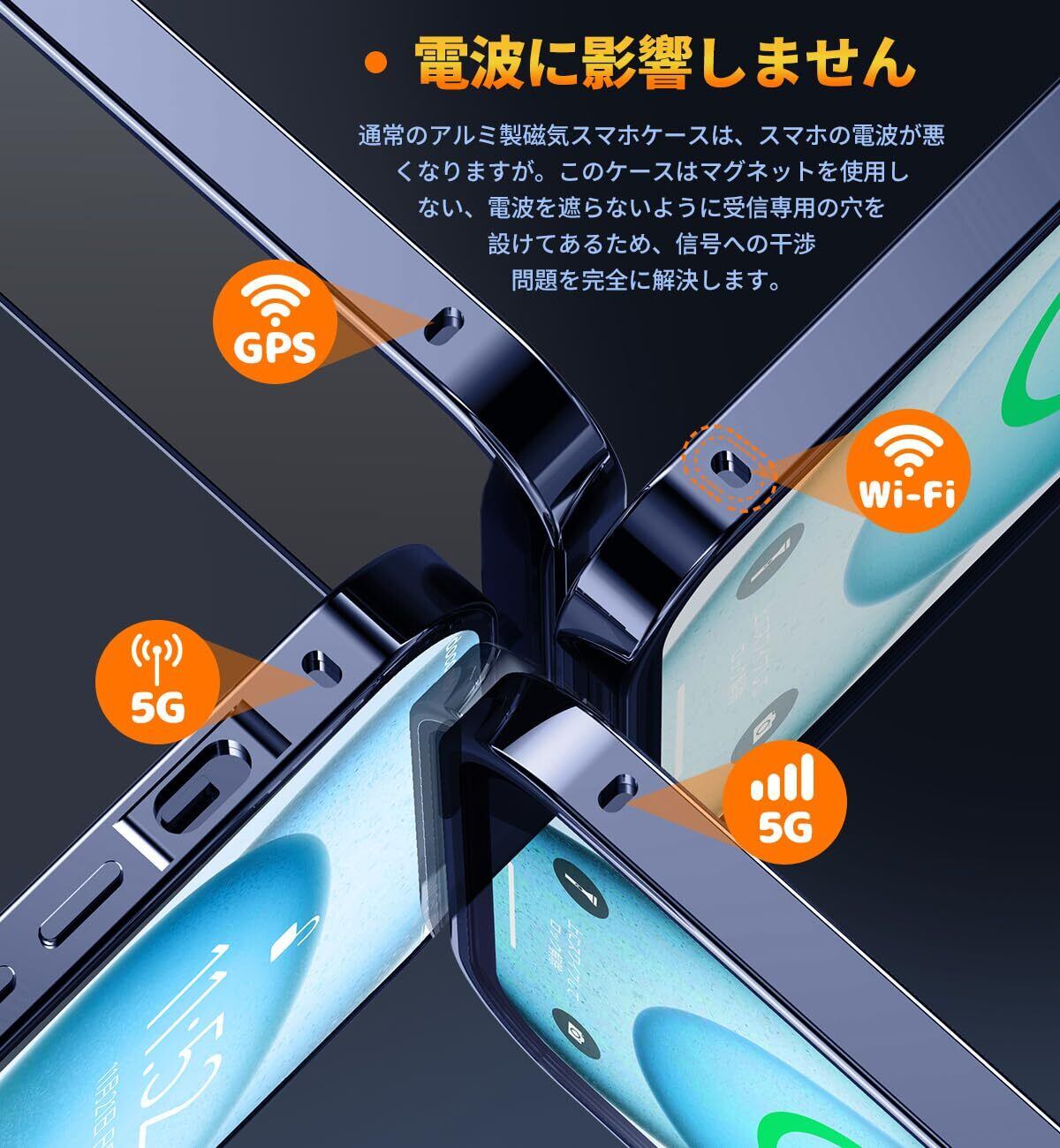 【メタルフレーム・背面クリア・信号干渉なし】このスマホケース iPhone15は、高品質の航空アルミニウム合金製フレームを使用しており、おしゃれで高級感が溢れています。酸化の表面処理により保護カバーは擦れに強い、傷つきにくい。このiPhone15全面保護ケースの背面として高透過率に経ったガラス素材を用い、本体の色をより良く楽しめる、より一層高級感を引き出せます。本体の美しさをエンジョイする際に、ご好みの写真・ステッカーなども入れ、カスタマイズが可能です。このiPhone15 ケースは信号強度が影響を受けないように設計されています。ケースはマグネットを使用しない、電波を遮らないように受信専用の穴を設けてあるため、信号は良好で、WiFiは遮られていません。