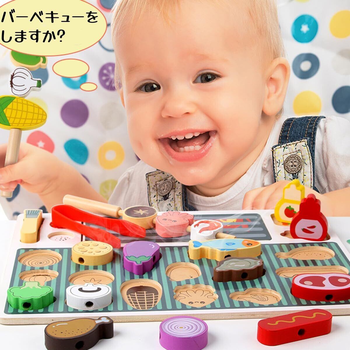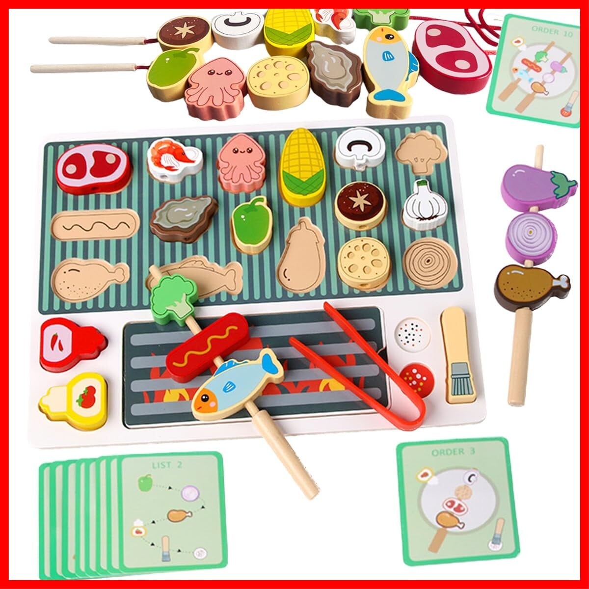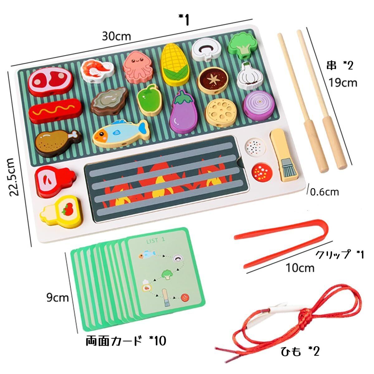 モンテッソーリ玩具 知育玩具 2 3 4 5歳 4in1バーベキューパズル はめこみ 形合わせ 棒通し 紐通しおもちゃ クリップで挟む ままごとおもちゃ Bajoy 指先訓練 早期開発 形状認知など多機能パズル 女の子男の子 誕生日 クリスマス プレゼント ゲームカード 収納袋付き | hananoki