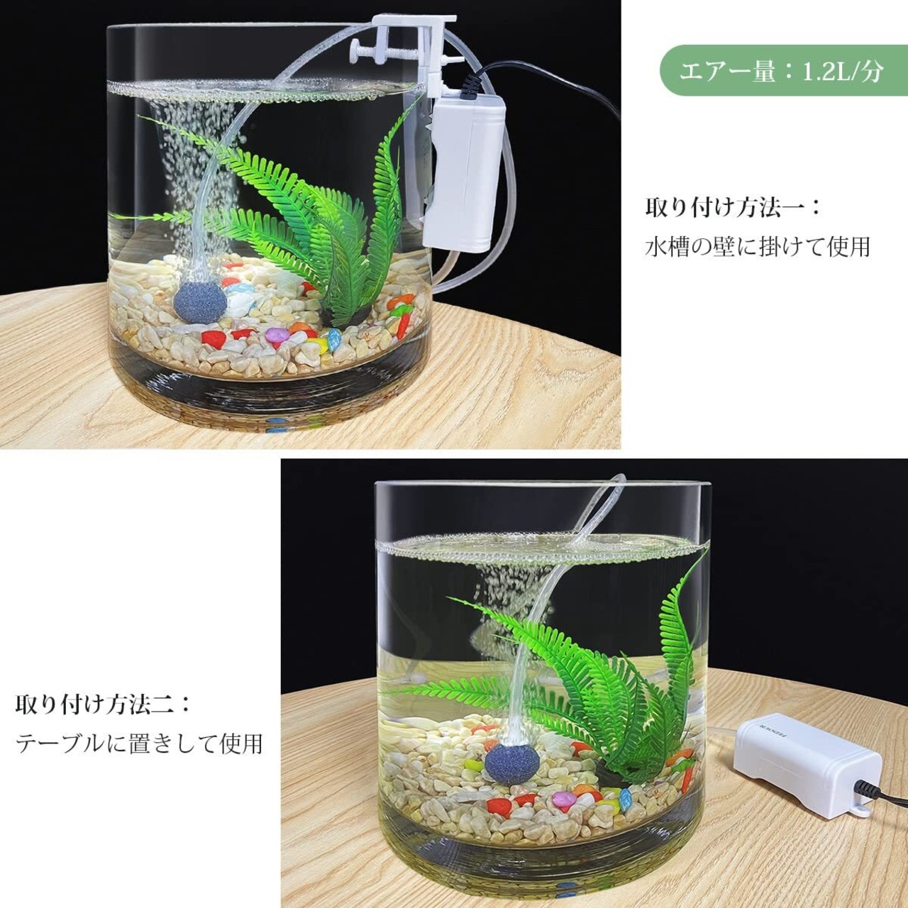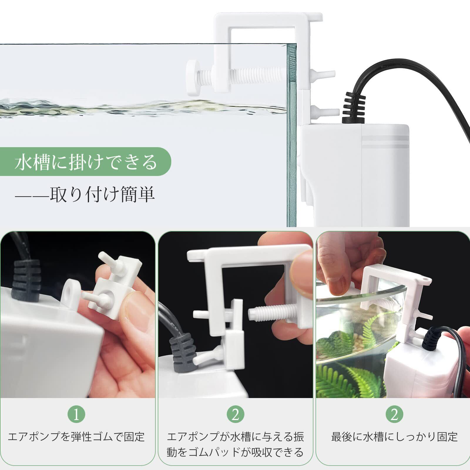 取り付けと使用は簡単です。指示に従ってアクセサリを接続するだけで、このエアポンプはぶくぶく気泡を発生することができます。付属品でエアー量調節も可能です。