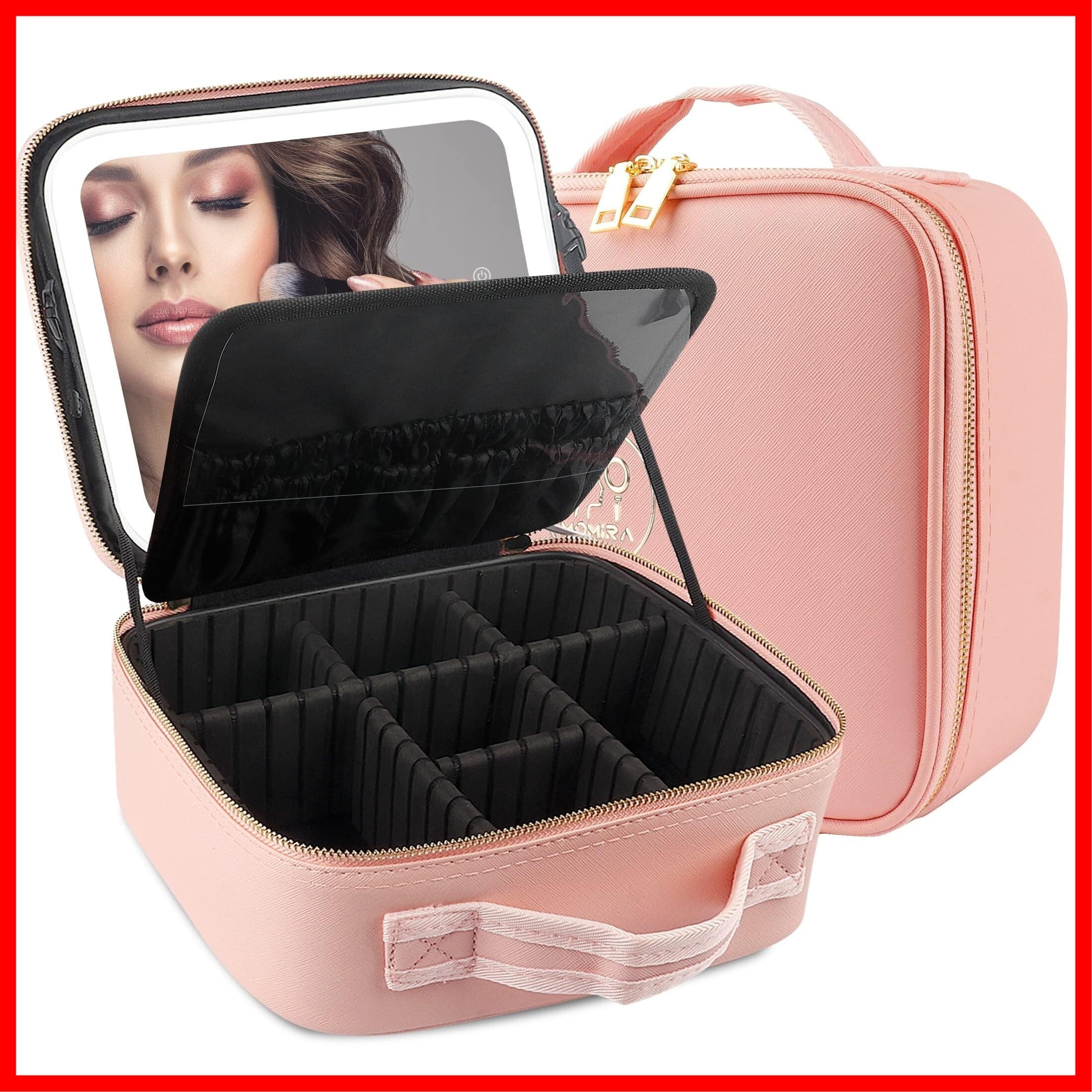 MOMIRA 鏡付きメイクボックス 化粧品収納ボックス コスメボックス 化粧ケース 調節可能な仕切り付き 3色調節可能なLEDライト メイクブラシケース付き 手持ち 大容量 自立式 プロ用 持ち運び 旅行 - ピンク