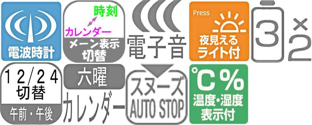 その他:温度表示(-9.9~50℃)、湿度表示(20~95%)、カレンダー、六曜、バックライト、止めても又鳴る「スヌーズ」機能