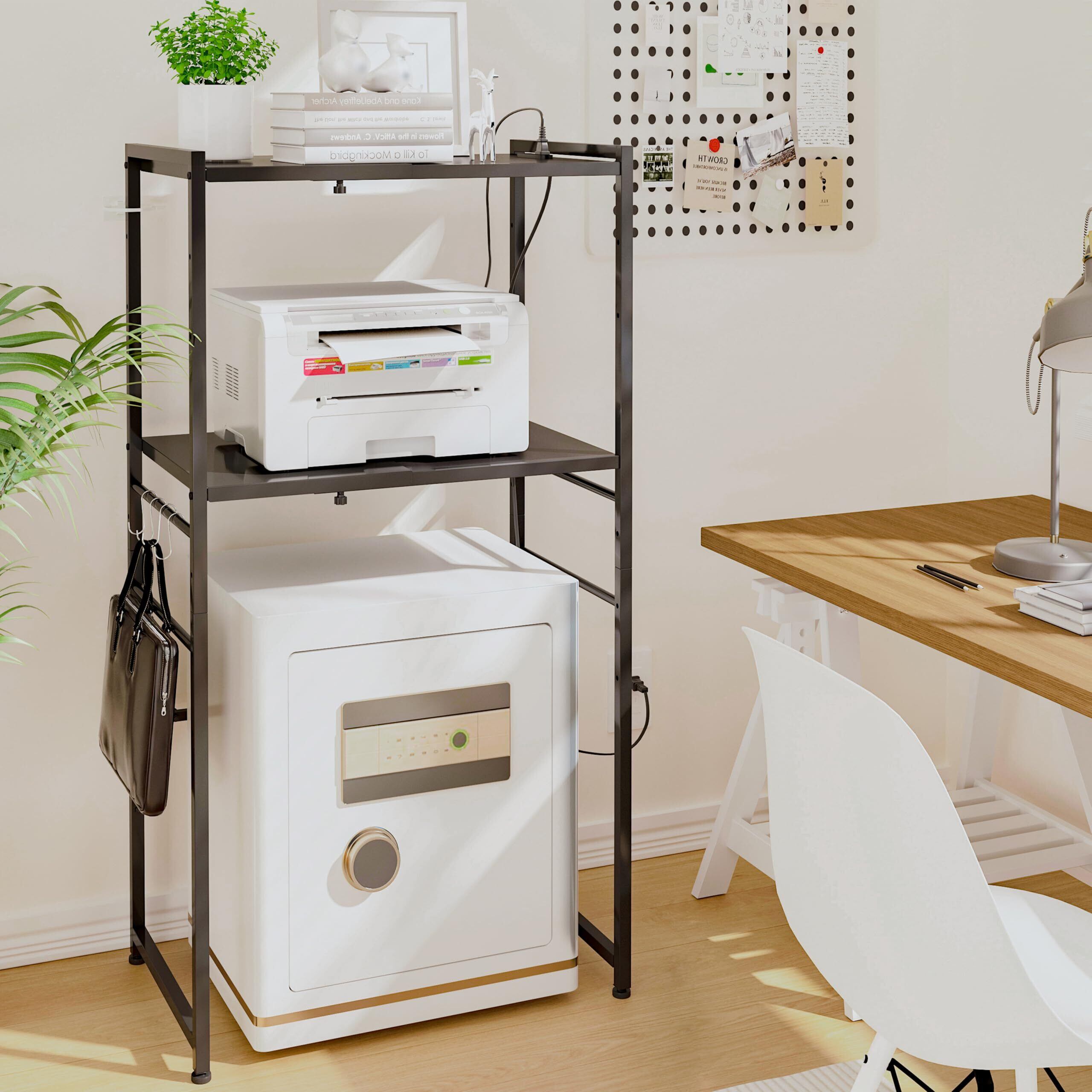 【多機能収納ラック】棚板は収納する物に合わせて高さを調整可能です。約11㎝ぐらいの8段階可動棚で、下部のスペースにはゴミ箱、冷蔵庫、洗濯機などを収納できます。棚板の上部にはレンジ台やプリント台などを置くことができます。