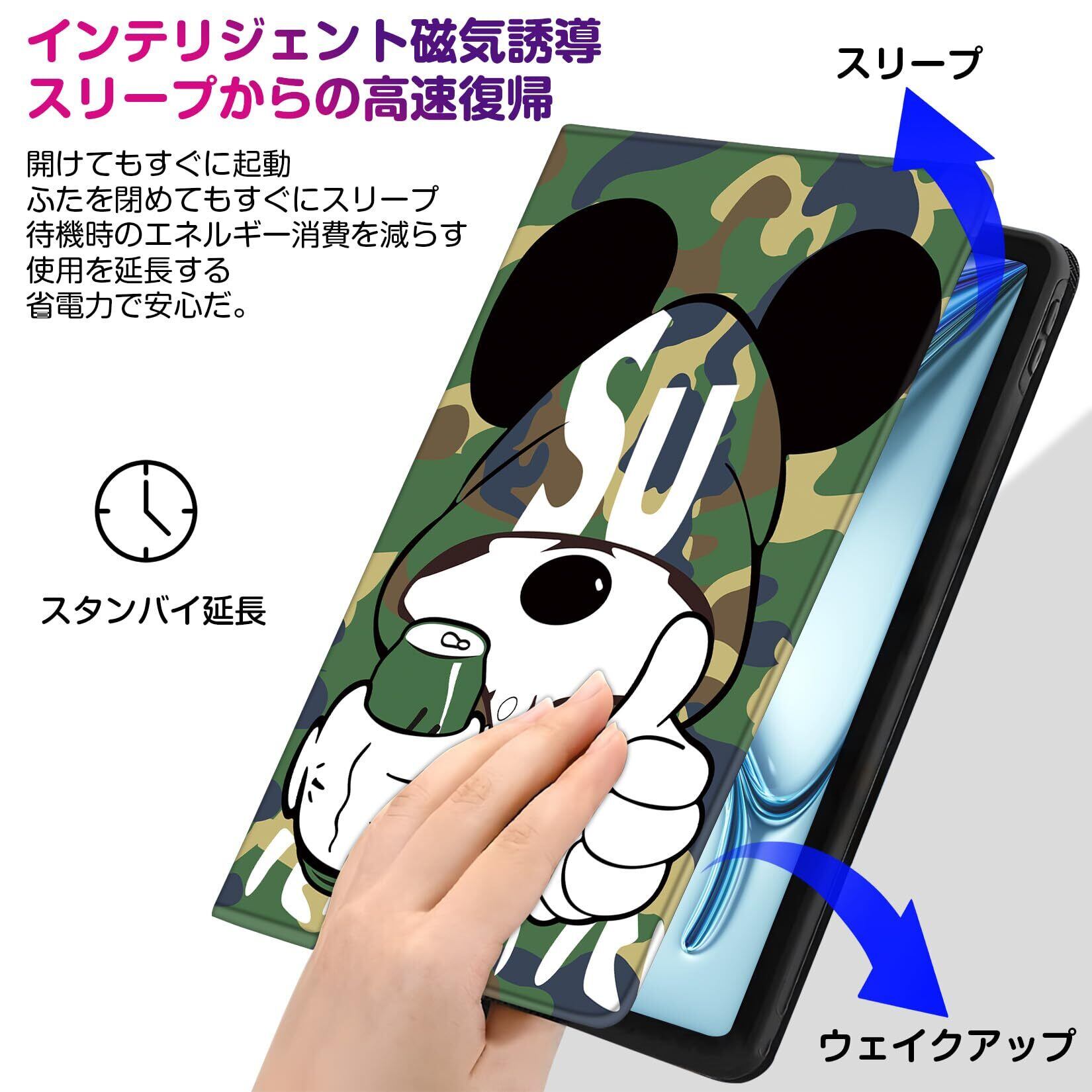 「オートスリープ機能」 オートスリープ機能でカバーを開ける閉めることで電源自動的にオン・オフなります。マグネット内蔵されているためカバンに入れてもカバーが勝手に開けることを心配必要なくしっかり閉められます。