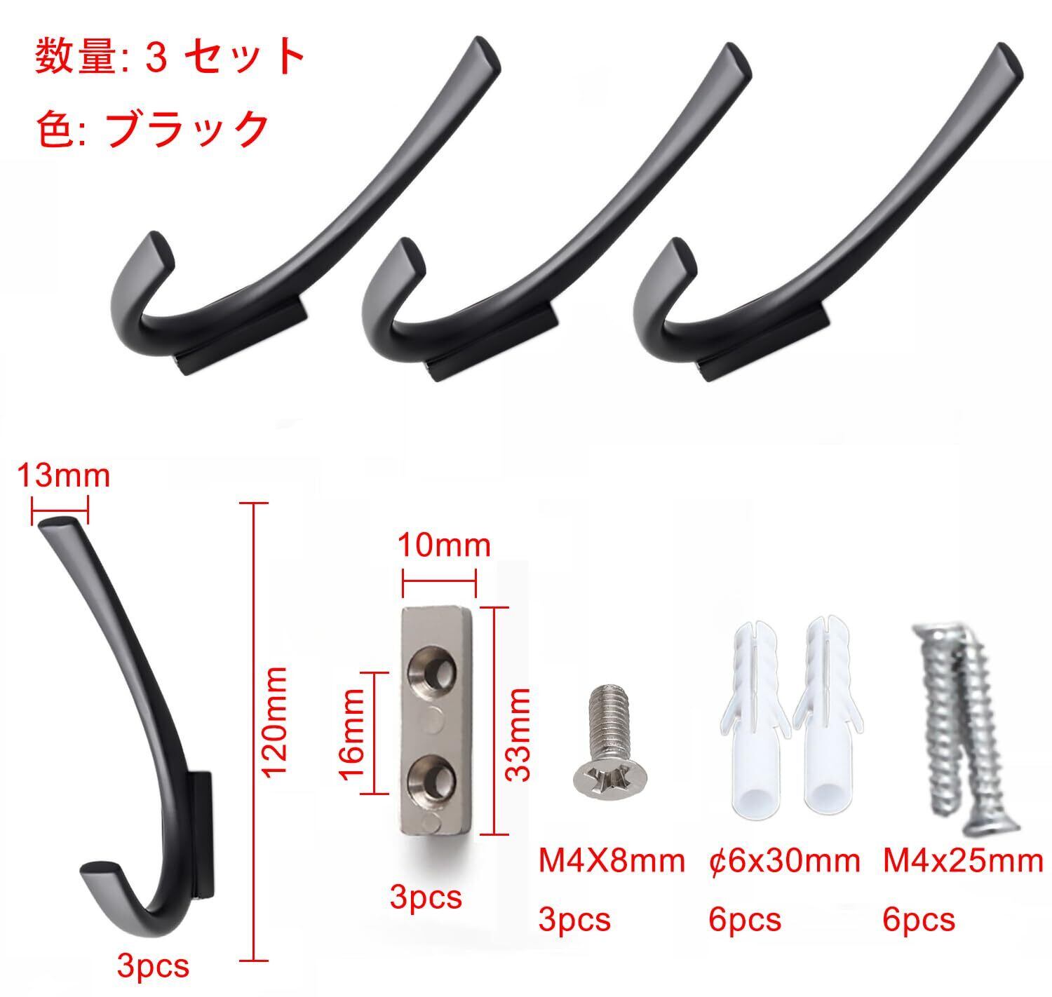 3 個 現代簡約な亜鉛合金ハンガー 服や帽子用 壁掛けハンガー 台所 壁かけ 高耐荷重 金具 さまざまな衣類、帽子、バッグの保管と整理に使用されます (ブラック)