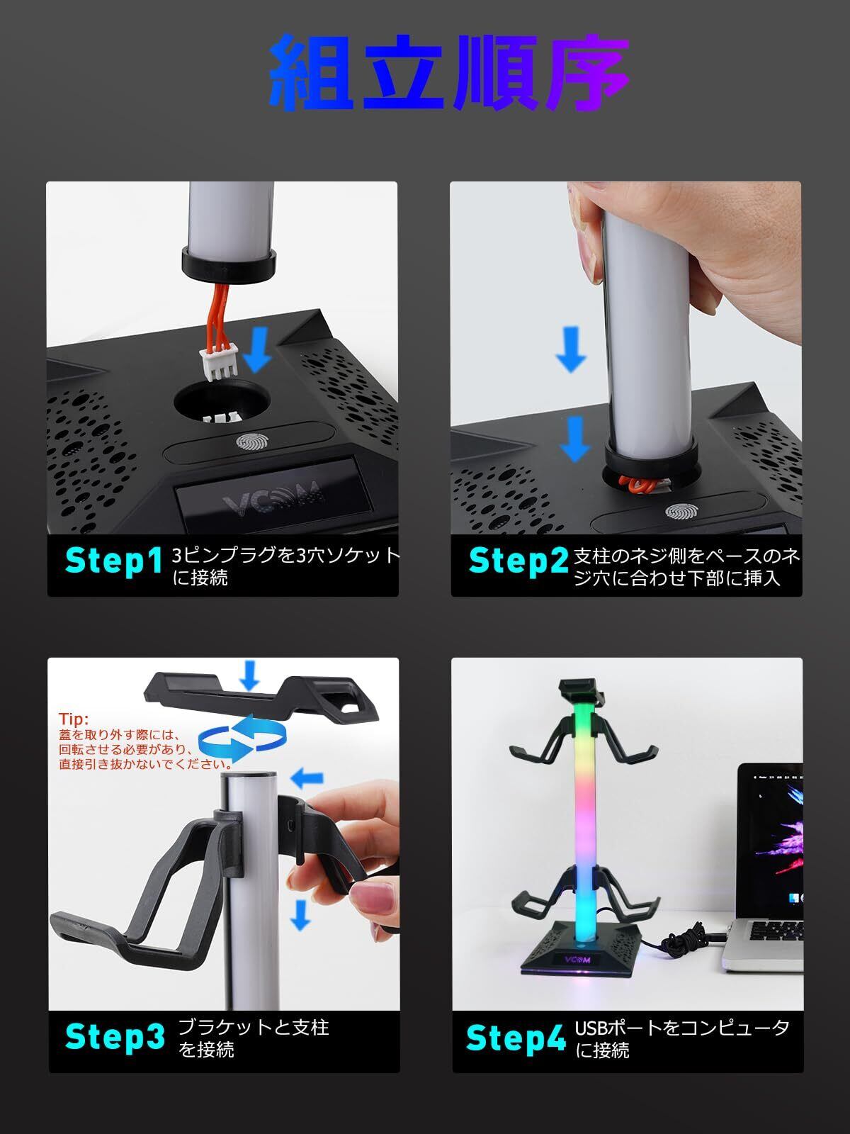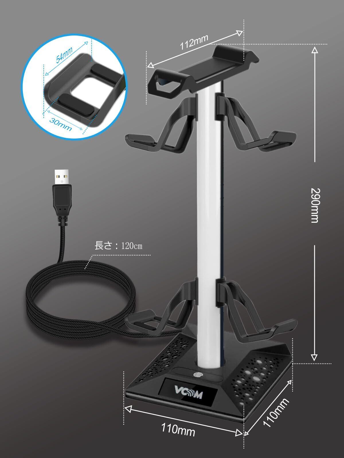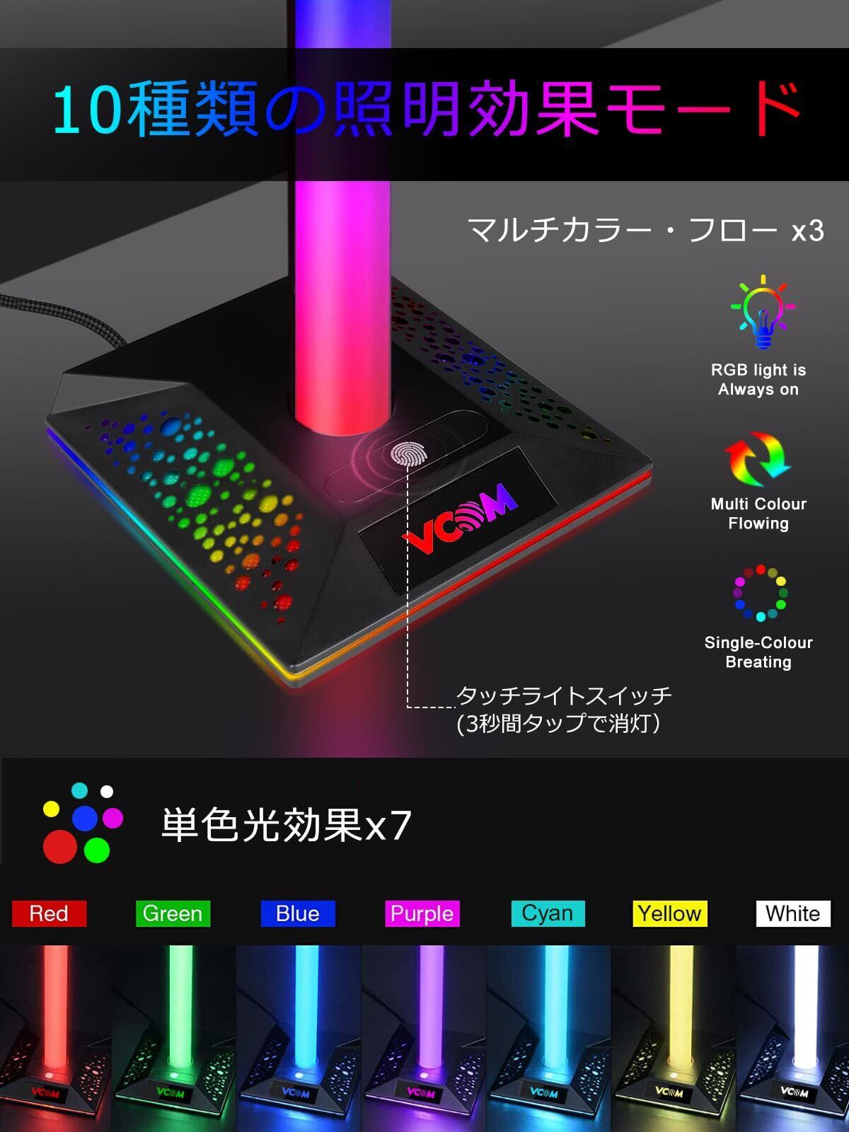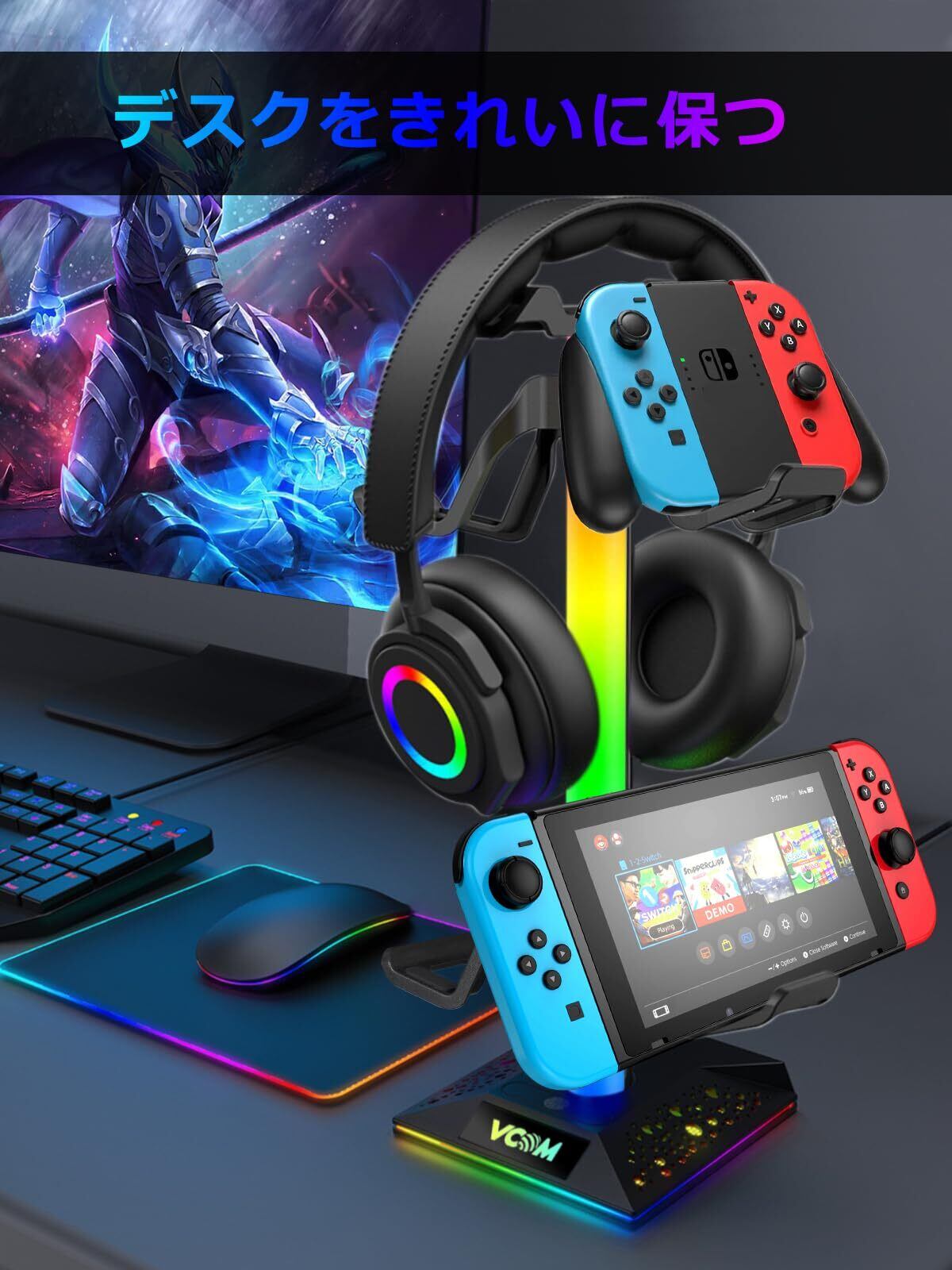 VCOMアップグレード版 ヘッドホンスタンド 多機能7色充電式 USB Aポート*2&USB Cポート*1搭載 [ゲームパッド &ゲームコントローラー&ヘッドセット ]ホルダー 収納対策 省スペース ヘッドホン/コントローラー/スイッチ/iPad/携帯電話/デスク用 組立簡単 ヘッドホンハンガ (ブラック)