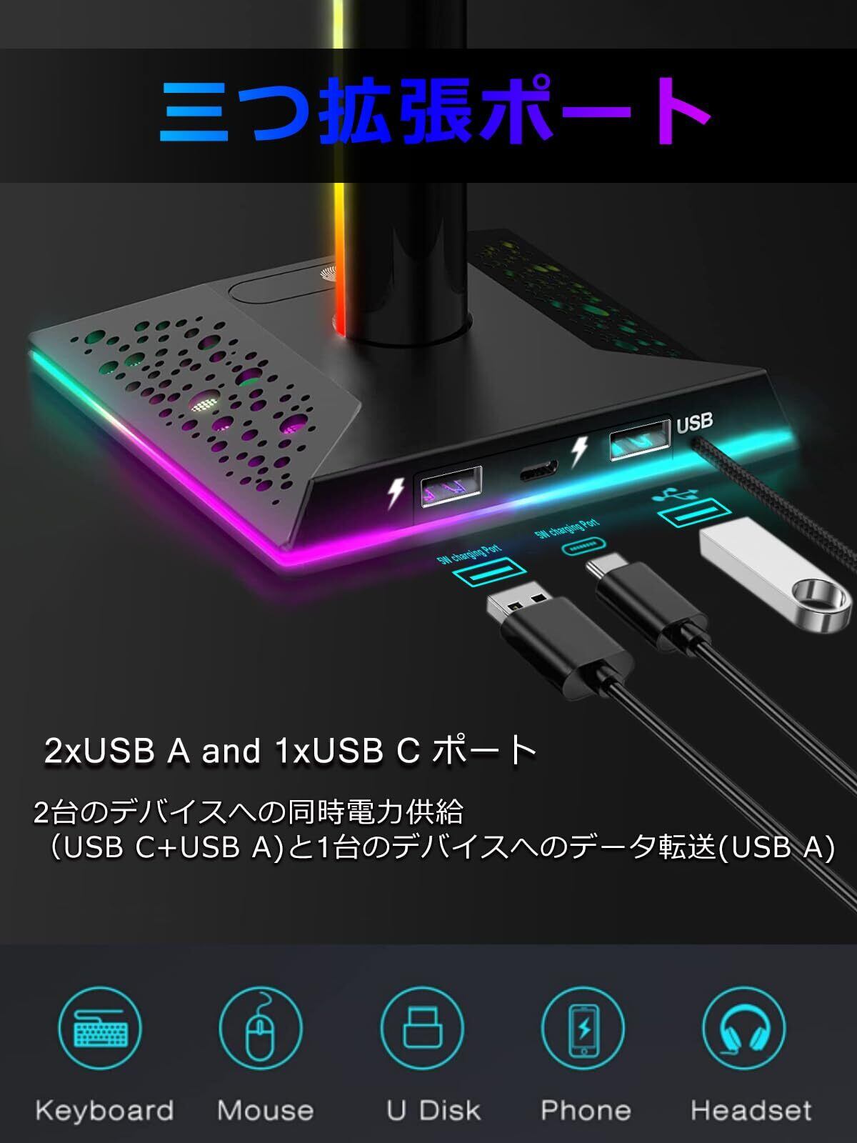 VCOMアップグレード版 ヘッドホンスタンド 多機能7色充電式 USB Aポート*2&USB Cポート*1搭載 [ゲームパッド &ゲームコントローラー&ヘッドセット ]ホルダー 収納対策 省スペース ヘッドホン/コントローラー/スイッチ/iPad/携帯電話/デスク用 組立簡単 ヘッドホンハンガ (ブラック) | hananoki