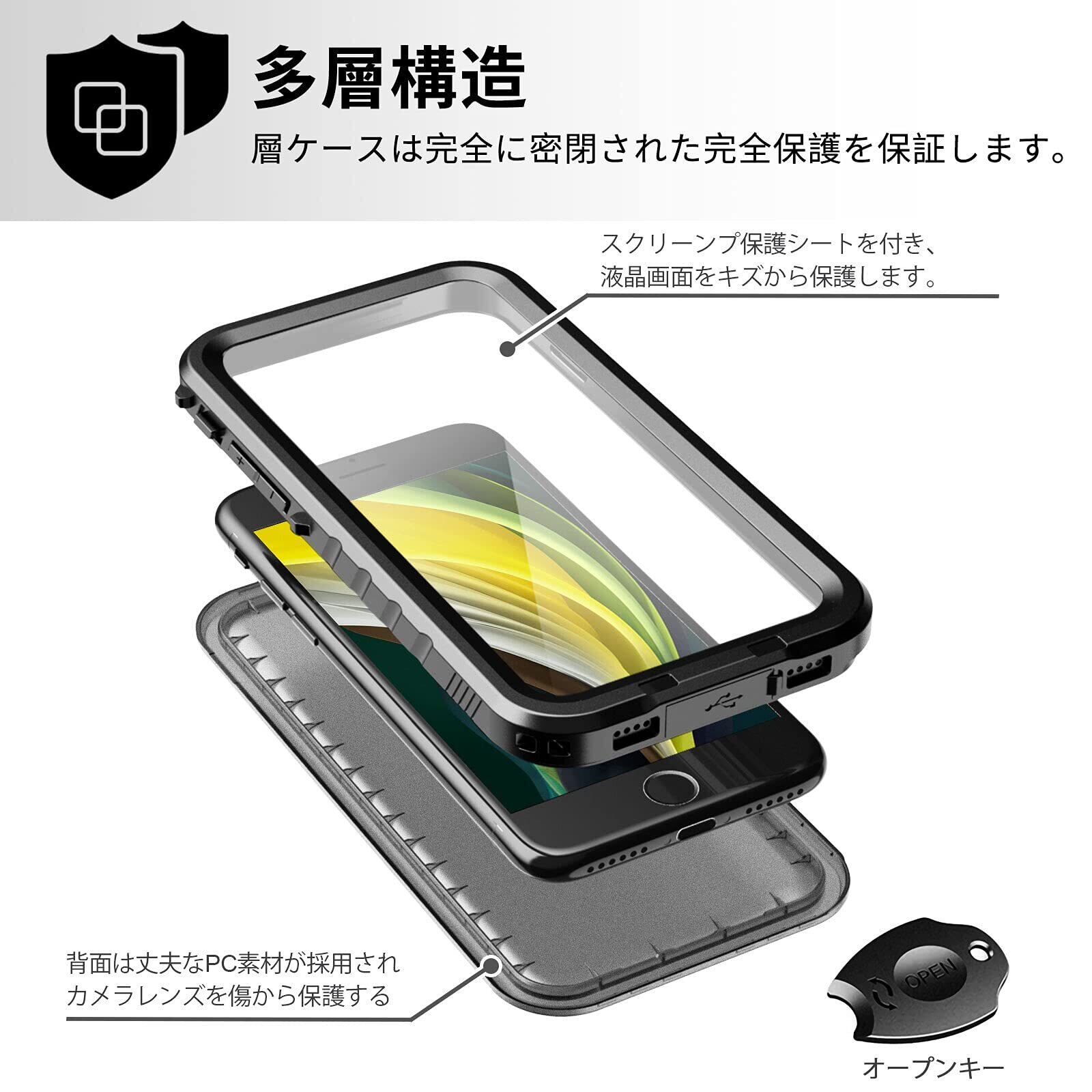 【IP68防水認定】iPhone SE 第3世代 / SE 第2世代 / iPhone7/ iPhone8 に対応できます。IP68防水認定を取得しております。水深さ2Mの水中に30分間まで水没できます。水気の多い場所でもスマホを守ってくれるため、いつもで安心してご利用いいただけます。