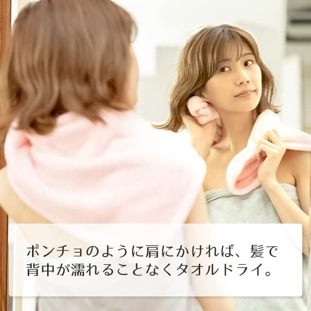 スナップボタンとまとめたタオルを通す輪っかがついています。お風呂上りのスキンケアは時間が勝負なのでサッとターバンを巻いてケアしましょう。ターバンを巻いてスキンケアや他のことをしている間に紙の水分を吸収してくれます。ドライヤーを当てる際には、ポンチョの用に方にかければ、髪で背中が濡れることなくタオルドライ、ヘアドライができます。