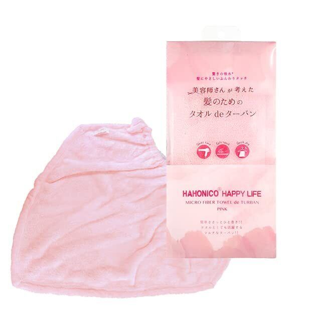 ハホニコ ヘアドライマイクロファイバータオル「美容師さんが考えた髪のためのタオル」のスナップボタンのついたターバンタイプです。生地は美容師さんが考えた髪のためのタオルと同じものを使用しているので、吸水性に優れ、水分を瞬時に拭き取りドライヤーをかける時間を大幅に短縮します。ヘアドライタオルにスナップボタンが付いたような形状で簡単に頭に巻くことができるので、お風呂上りにサッと巻くだけで髪の水分を吸収してくれます。お風呂上りには、サッと頭に巻いて、フェイスケアやお化粧を行い、その後、髪をおさえ拭きすることで髪に残った水分をしっかり吸収し、ドライヤー時間を短縮することができます。ドライヤー時間が短縮=ドライヤーの熱によるヘアダメージを抑えることができます。