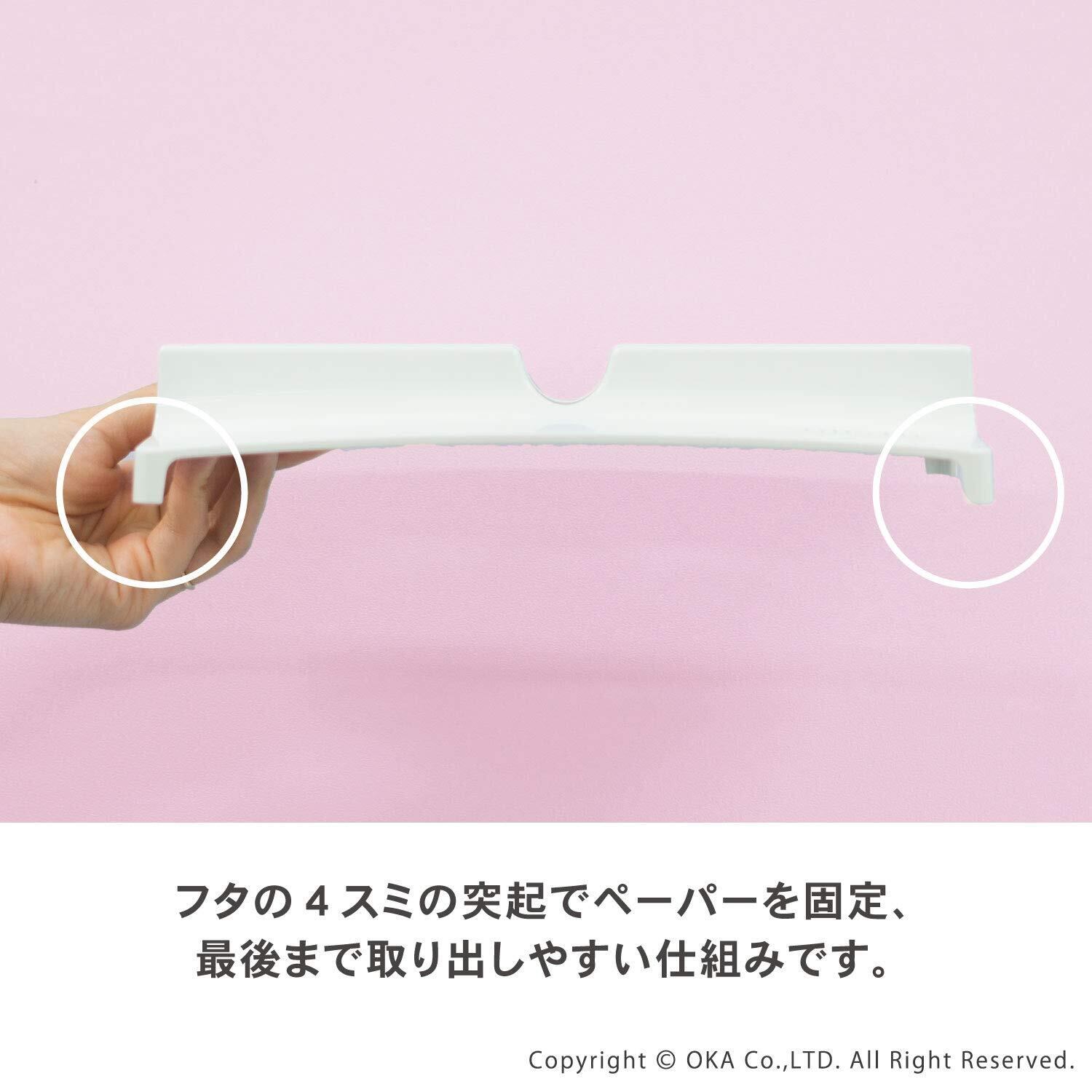 次のペーパーが取り出しやすい凸型設計で、袋入りペーパーをそのまま入れてフタを置く簡単設置です。 フタの四隅の突起でペーパーを固定するので、最後まで取り出しやすい仕組みです。