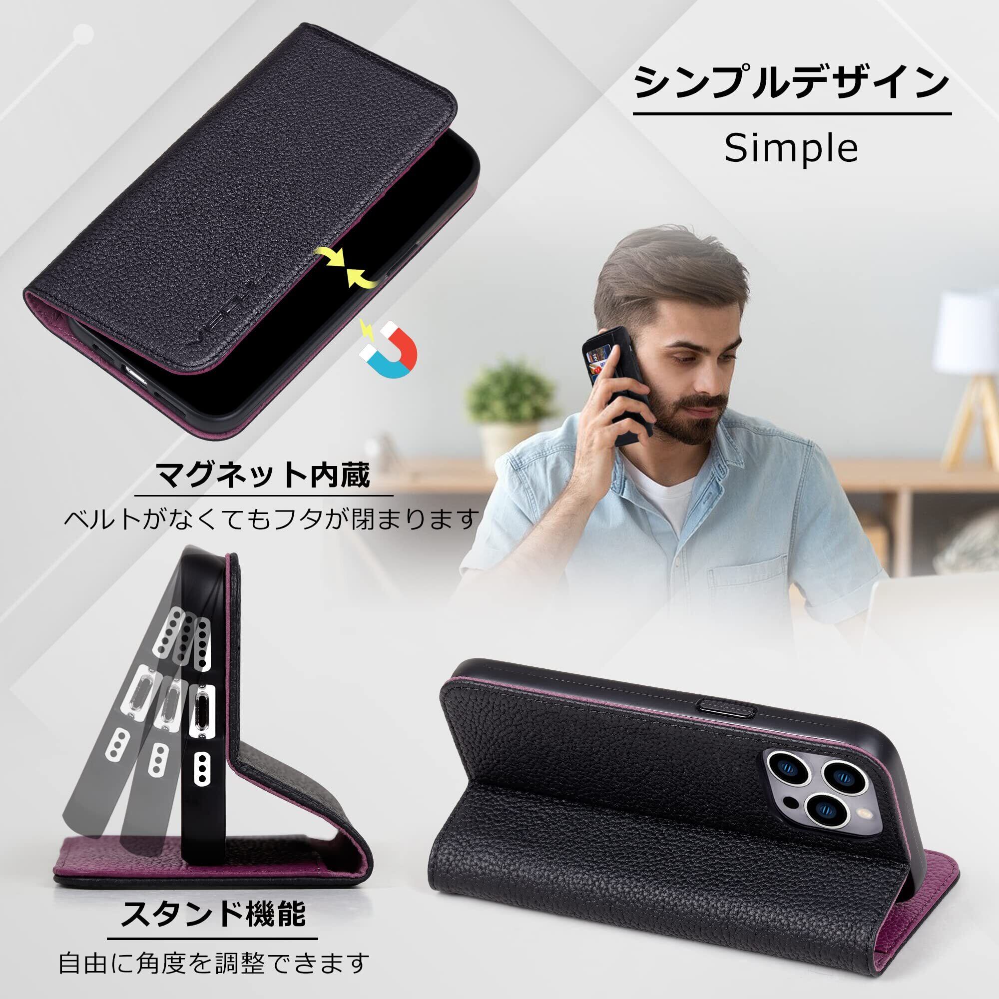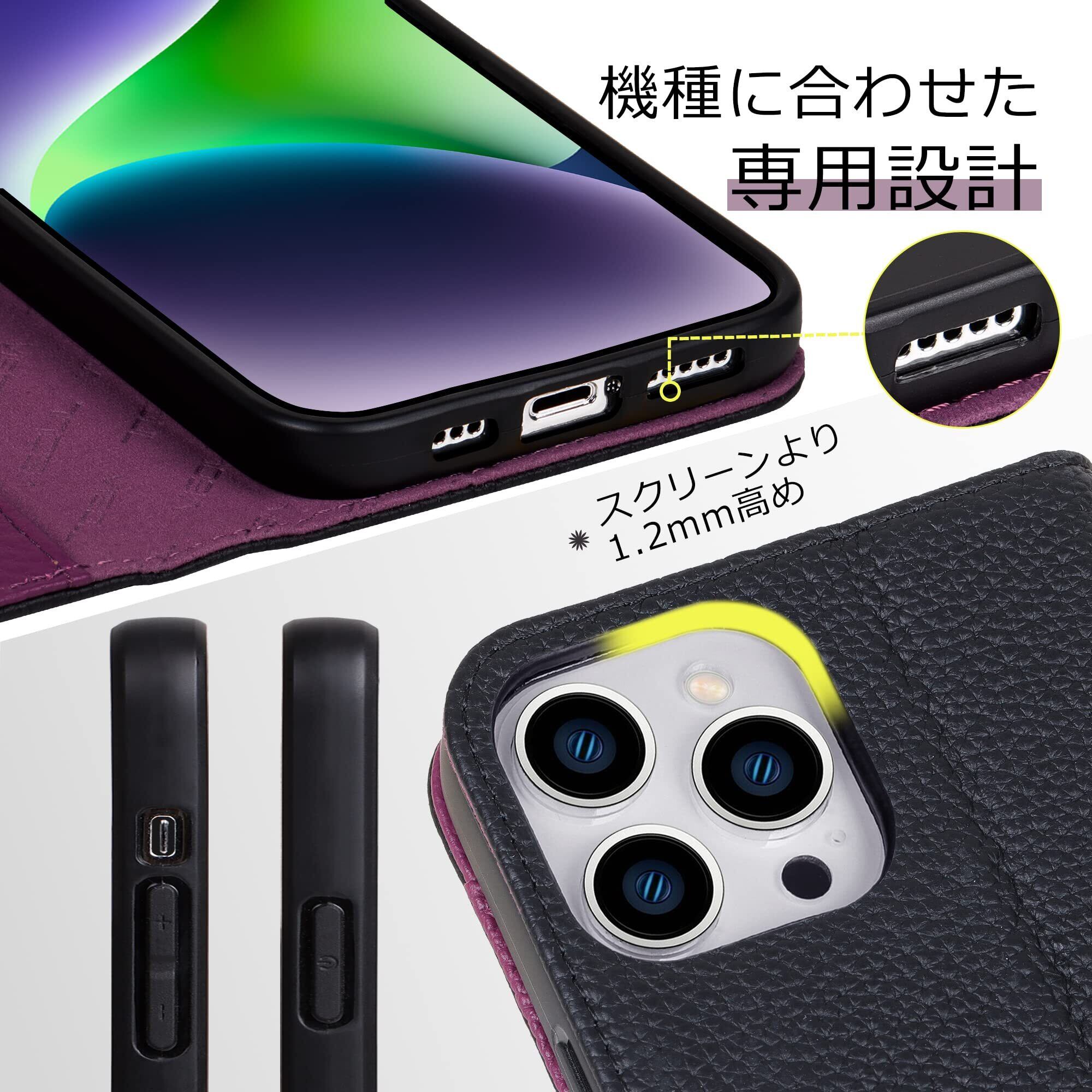 VISOUL iPhone 12 ケース 手帳型 本革 iPhone 12Pro ケース レザー スマホケース カード収納 携帯ケース 全面保護 マグネット 横置きスタンド機能付き iPhone 12 Pro ケース iphone 12Pro/12対応 6.1インチ シュリンクレザー iPhone 12 / 12Pro ブラック パープル | hananoki