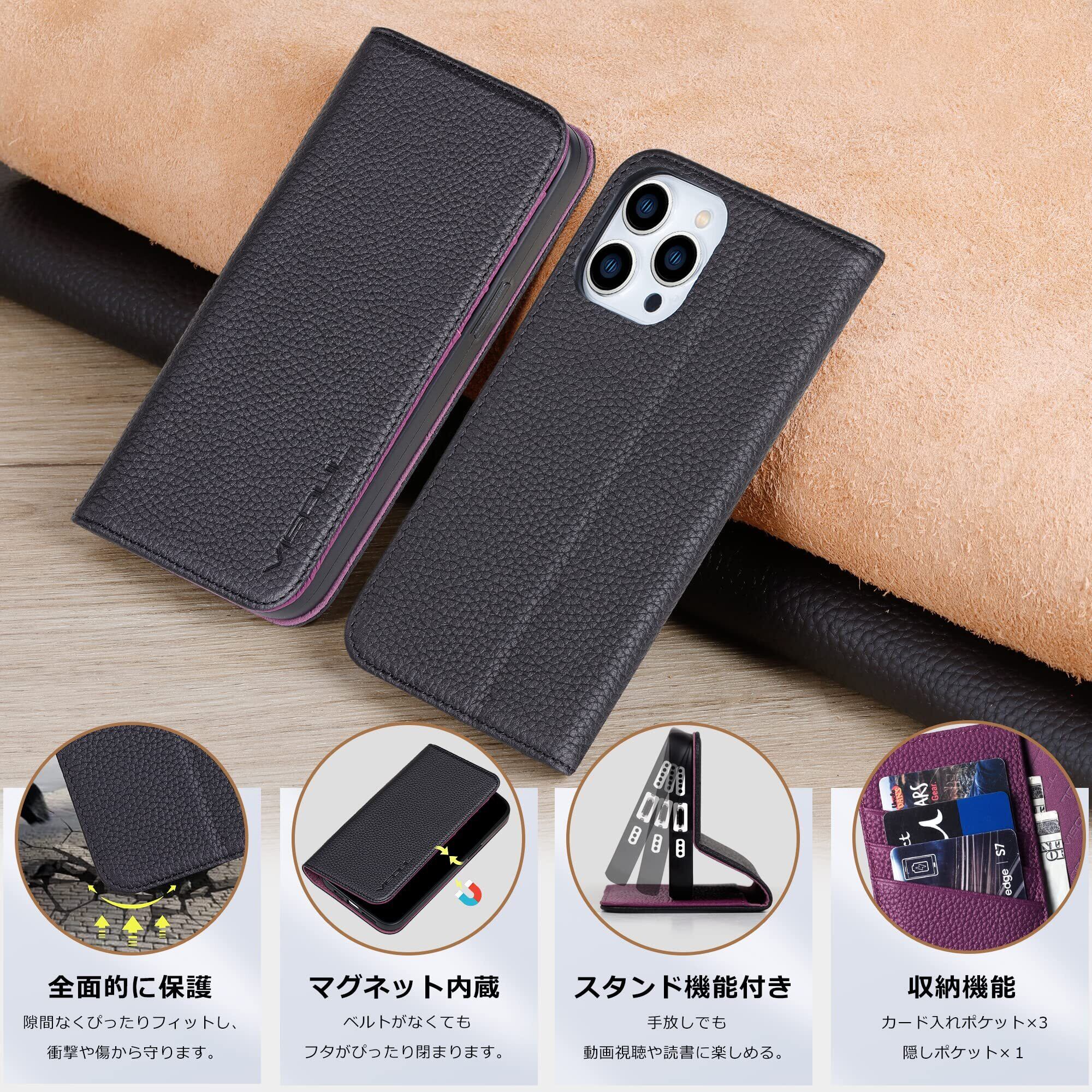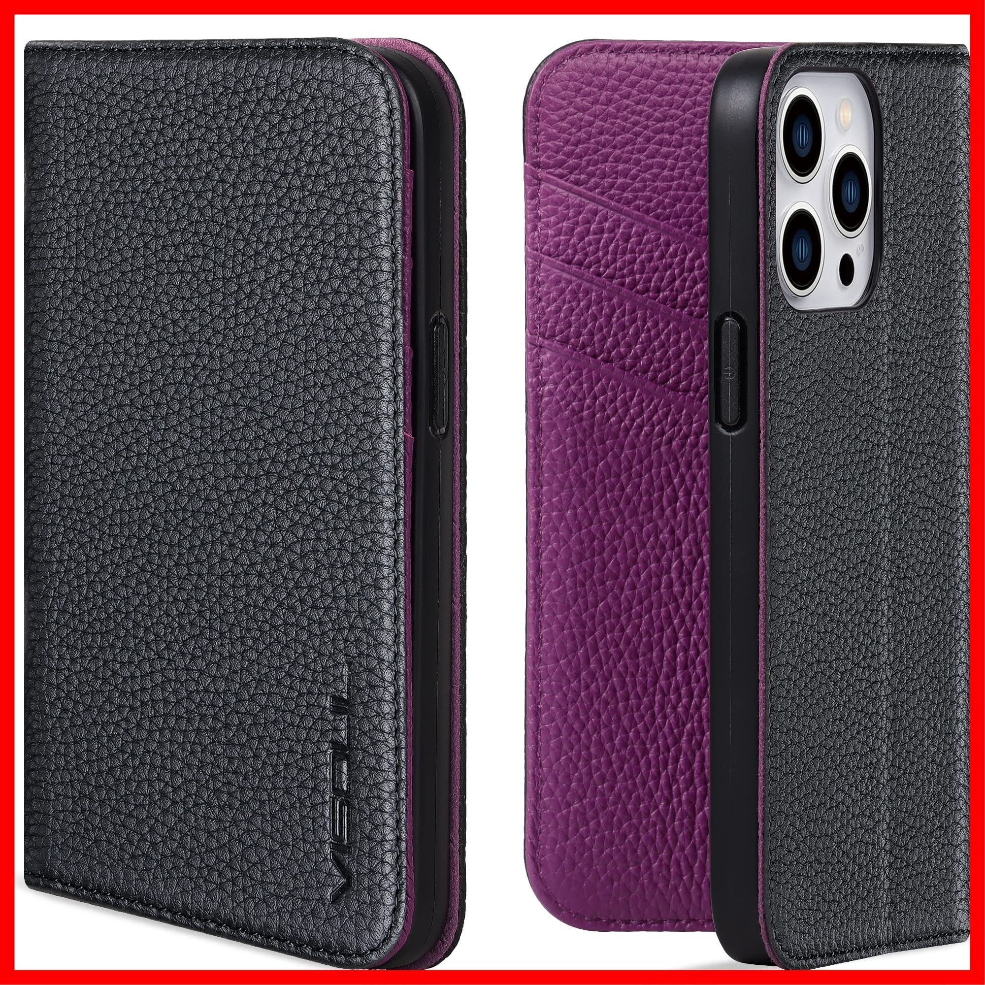 VISOUL iPhone 12 ケース 手帳型 本革 iPhone 12Pro ケース レザー スマホケース カード収納 携帯ケース 全面保護 マグネット 横置きスタンド機能付き iPhone 12 Pro ケース iphone 12Pro/12対応 6.1インチ シュリンクレザー iPhone 12 / 12Pro ブラック パープル
