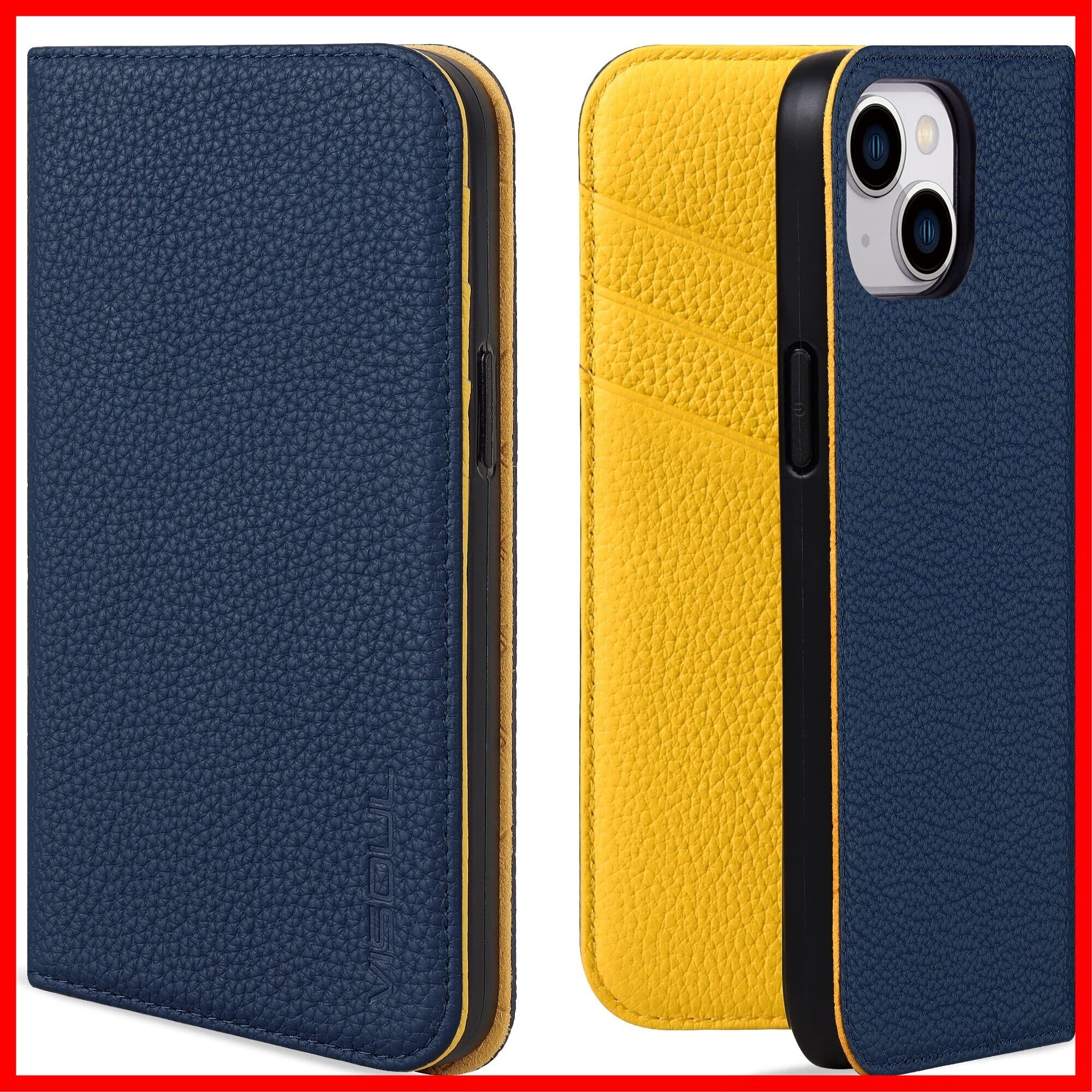 VISOUL iphone14 ケース 手帳型 本革 レザー スマホケース アイフォン14手帳型 カード収納 携帯ケース 全面保護 柔軟なTPU素材 マグネット式 スタンド機能付き アイホン14 対応 6.1インチ iphone 14 ネイビー レモン