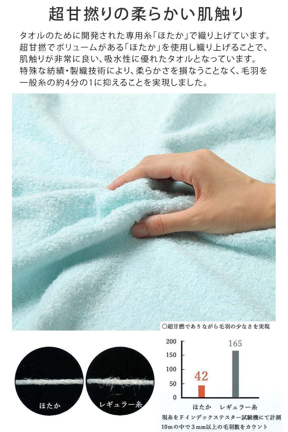タオルのために開発された専用の糸「ほたか」を使って織り上げています。超甘撚でボリュームがある「ほたか」を使用し織り上げることで、肌触りが非常に良く吸水性に優れたタオルとなっています。極限まで撚りを落とすことで糸の白度と光沢感が増し、染色した際には色鮮やかなタオルに仕上がります。また、特殊な紡績・製織技術により、柔らかさを損なうことなく、毛羽を一般糸の約4分の1に抑えることを実現しました。