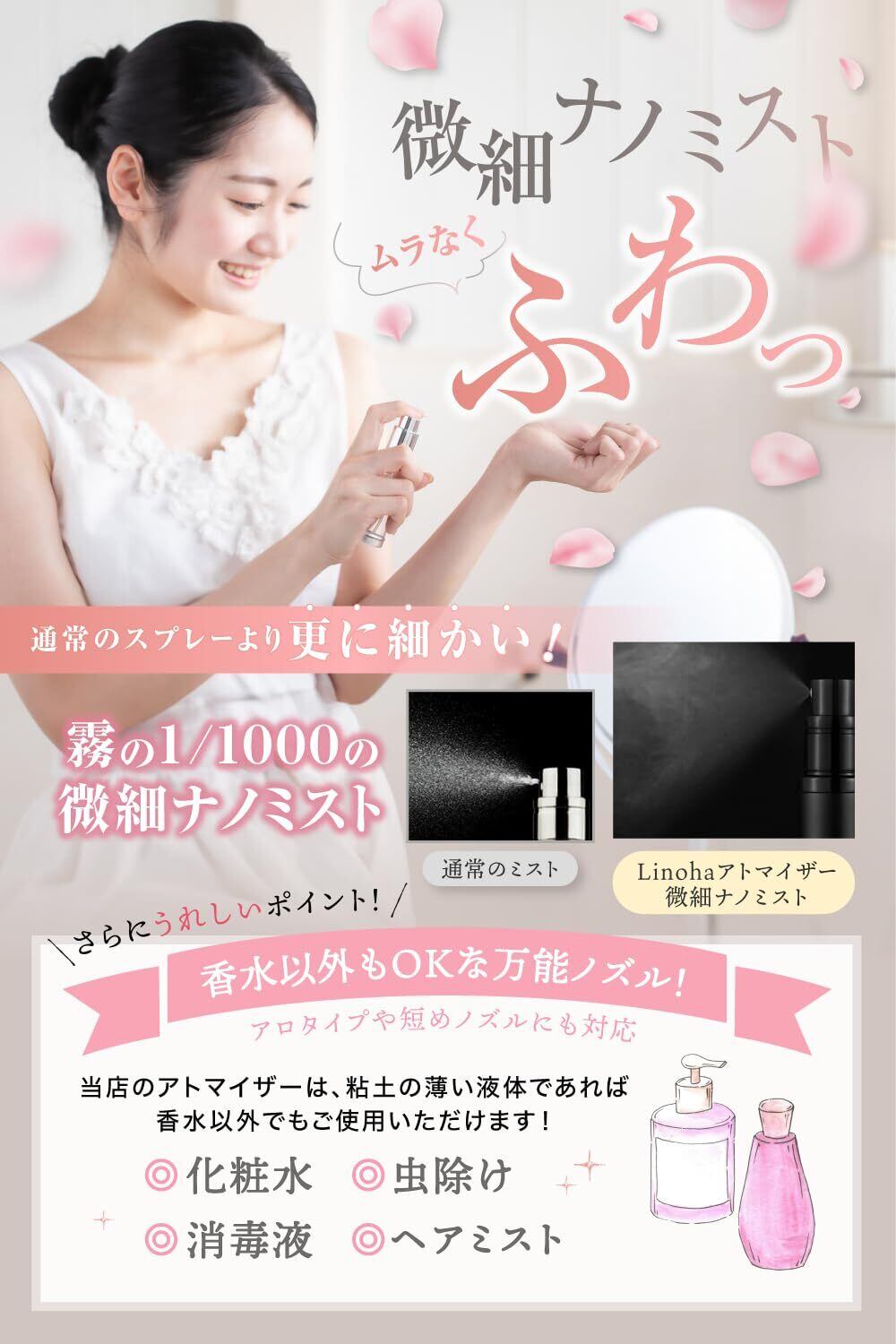 【香水以外でのご使用について】本アトマイザーは香水入れ用として開発されておりますが、化粧水、虫よけ、ヘアミストにも使うことができます。 ※ただし、充填できるノズルはスプレータイプのみとなります※ 香水以外のご利用の際は、必ずスプレータイプのノズルの容器に移し替えてからの充填が必要となります。ご理解の上お買い求めください。ロールオンの香水にも使用できませんのでご了承ください。