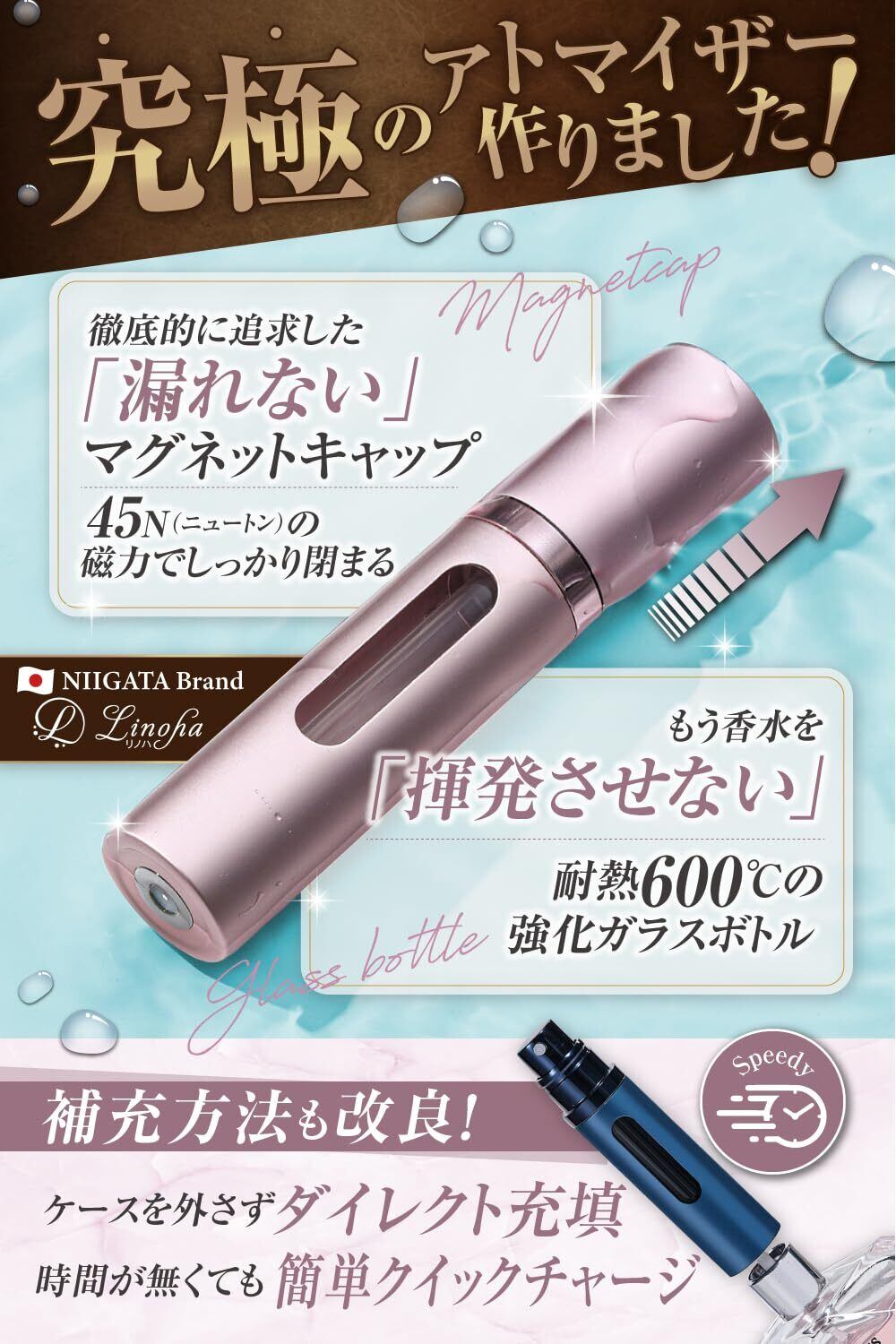 【漏れない&揮発しない!香水アトマイザー】蓋が外れて知らないうちに中身が…ということを防ぐためにキャップにマグネット式を採用。45Nという磁力の強さで閉めやすく、外れにくいを実現させました!そしてボトルの中で香水を揮発させないために高品質ガラスボトルを採用しました。PCTG樹脂よりも遥かに高い耐熱温温度によって香りの変化や揮発して量を減らす心配がなくなりました。