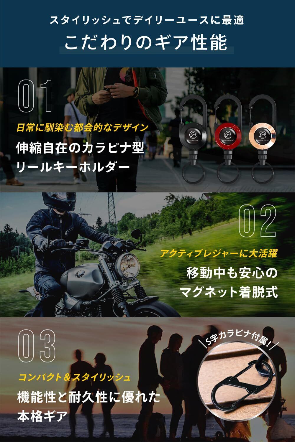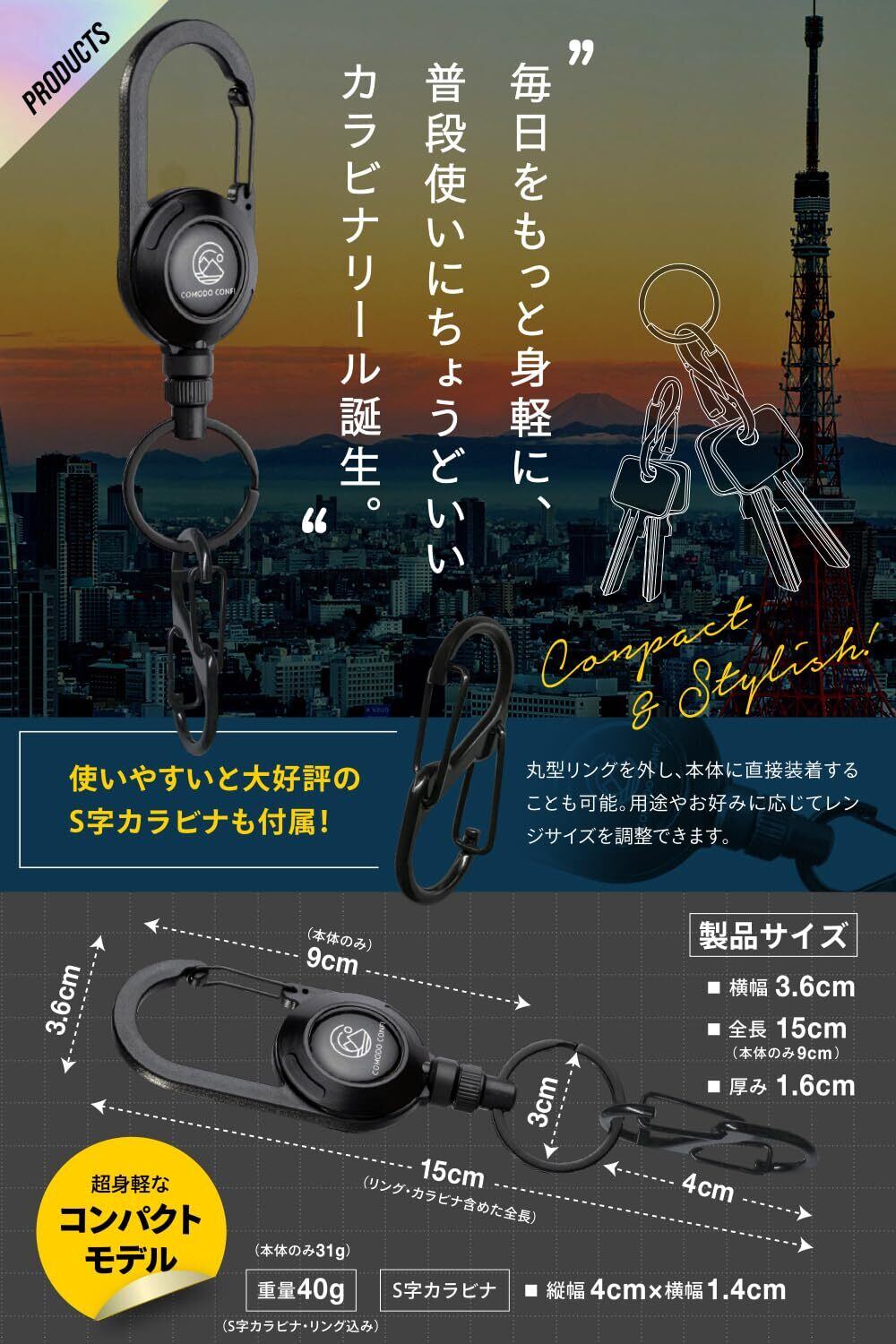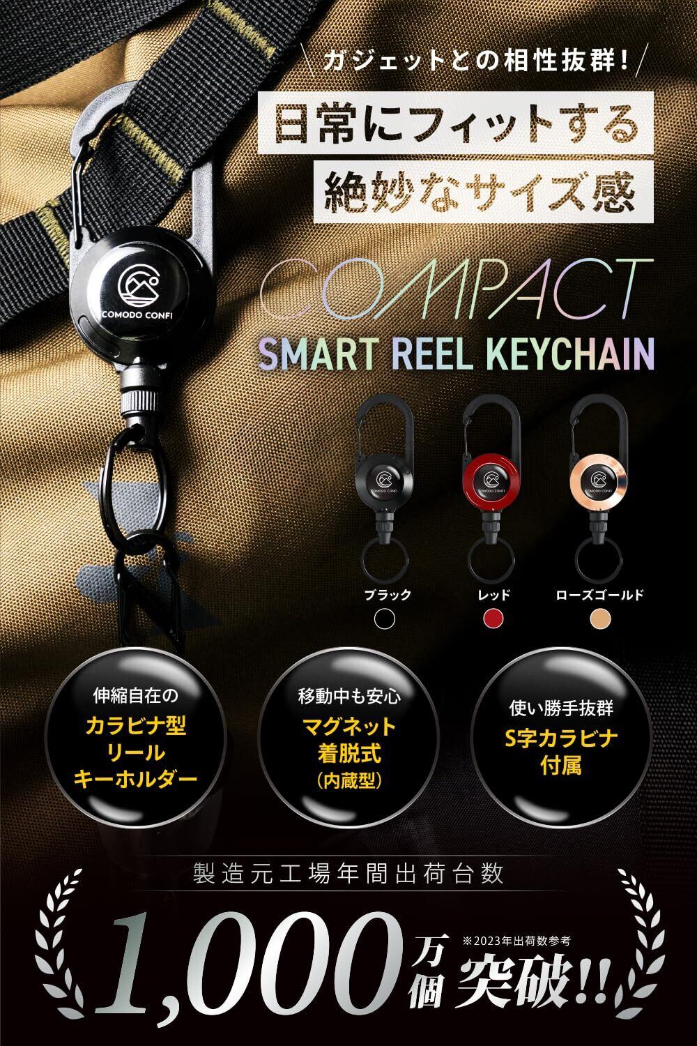 [COMODO CONFI] 「日常生活にフィットする絶妙なサイズ感!」 カラビナ リールキーホルダー コンパクトタイプ キーリール [強力マグネット内蔵型リール] 伸縮自在 コンパクト オフィス アウトドア 釣り 全3色