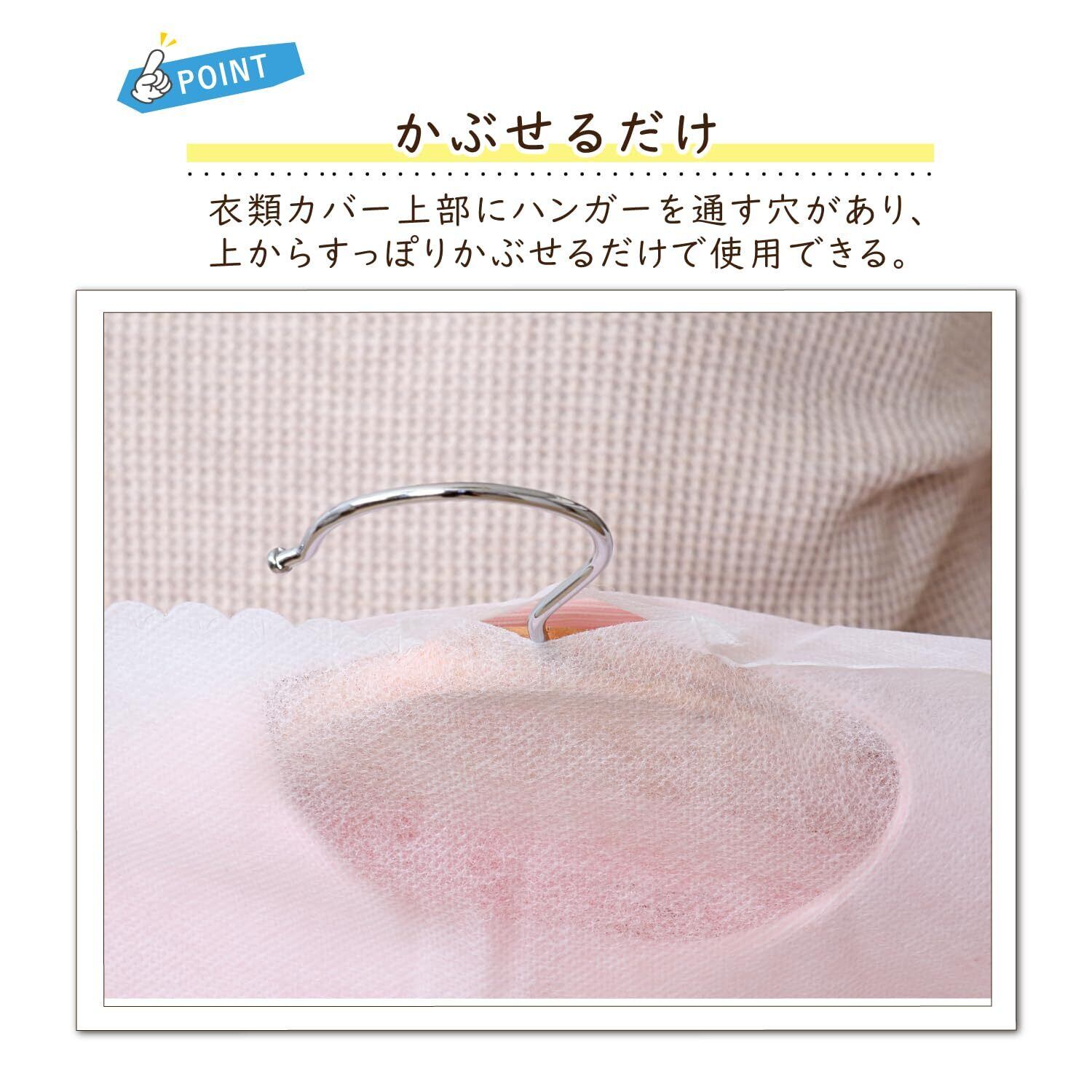 【洋服の毛玉や傷みを防ぐ・丈の長さを調節できる】:カバーを掛けておくことで保管中に洋服同士が擦れず、毛玉の発生や傷みを防げる。カバーの裾をハサミでカットすることもできるので、洋服の長さに合わせて使える。