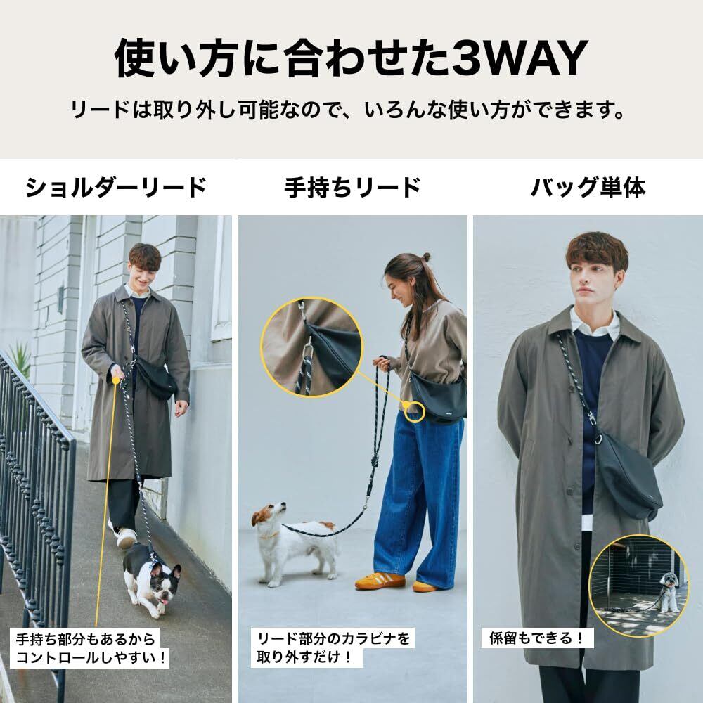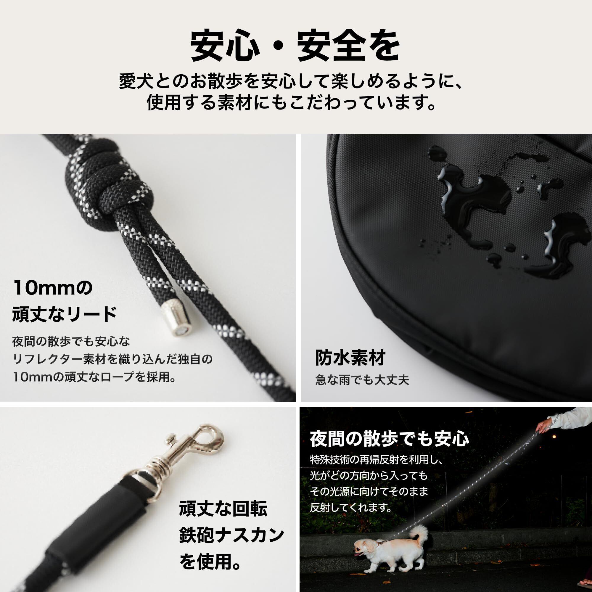 スタイリッシュでファッションに馴染むデザイン: 見た目のデザイン性にもこだわり、リードやバッグがおしゃれに見えるのが特徴。シンプルながら洗練されたスタイルで、服装を選ばず、日常のファッションにもなじみやすいのが魅力です。