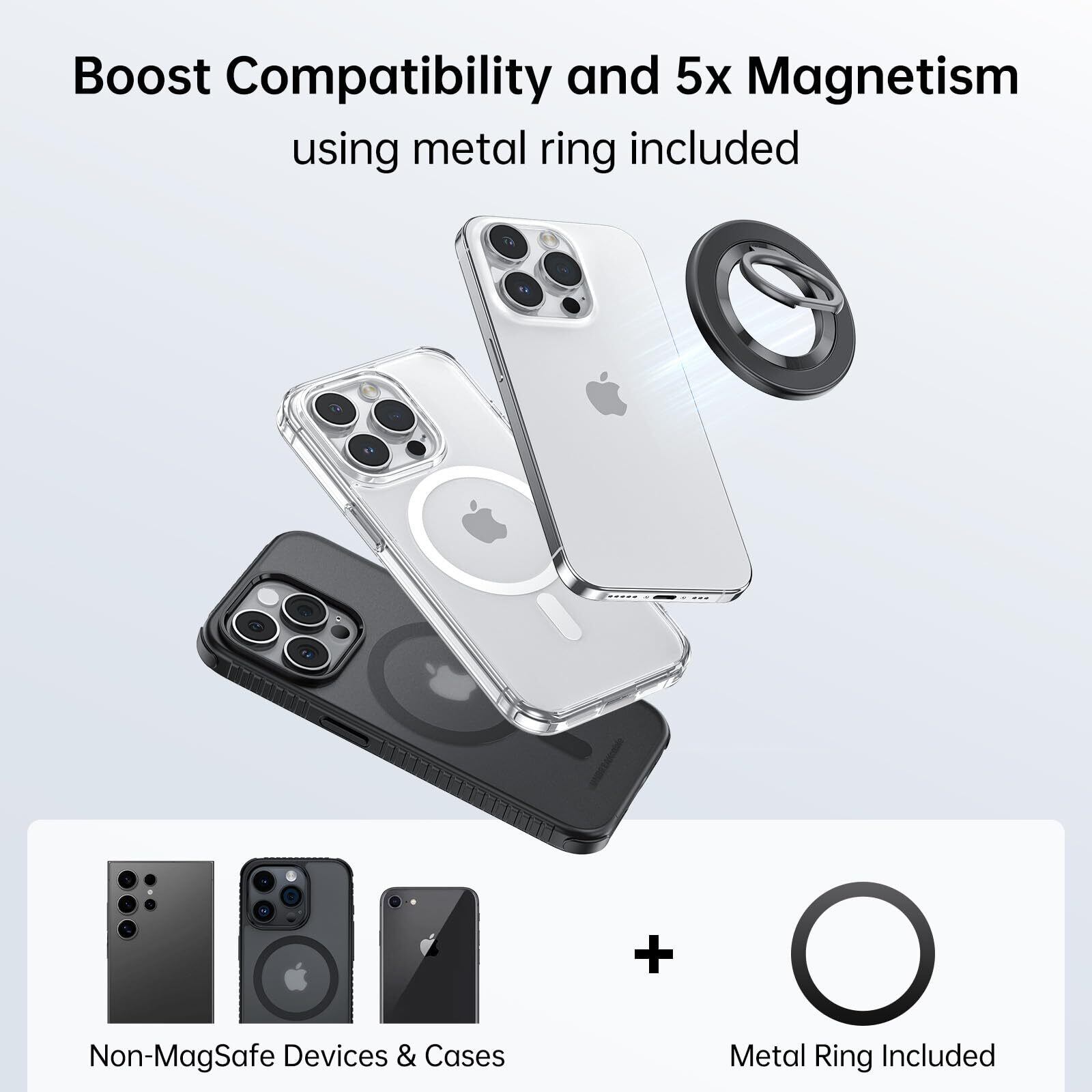 対応機種:iPhone 16, 16 Pro, 16 Plus, 16 Pro Max, 15, 15 Pro, 15 Plus, 15 Pro Max, 14, 14 Pro, 14 Pro Max, 14 Plus, 13, 13 Pro, 13 Pro Max, 13 Mini, 12, 12 Pro, 12 Pro Max, 12 Miniの本体やMagSafe搭載ケースに直接装着可能です。付属されたメタルリングを利用すると、磁力がもっと強くなります。