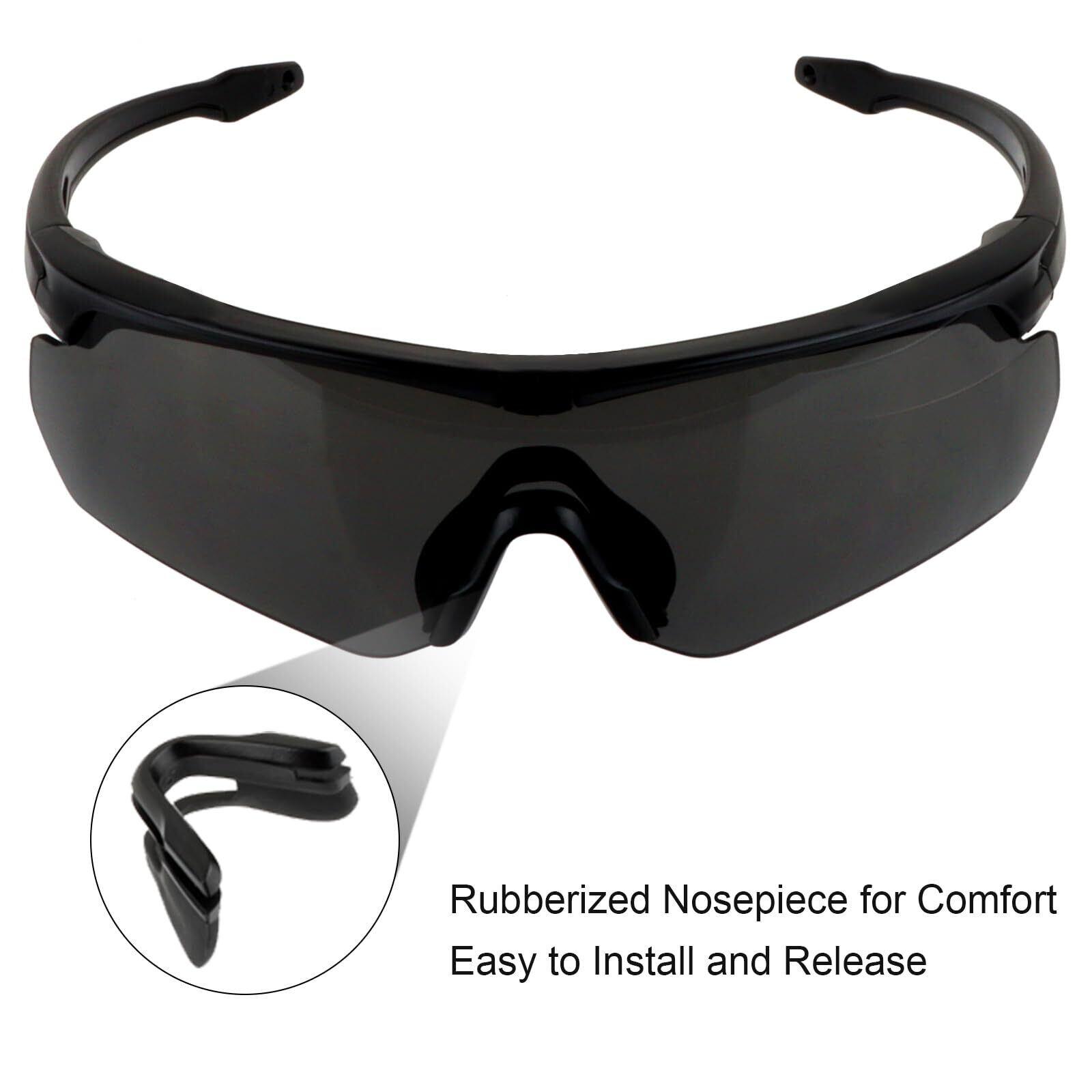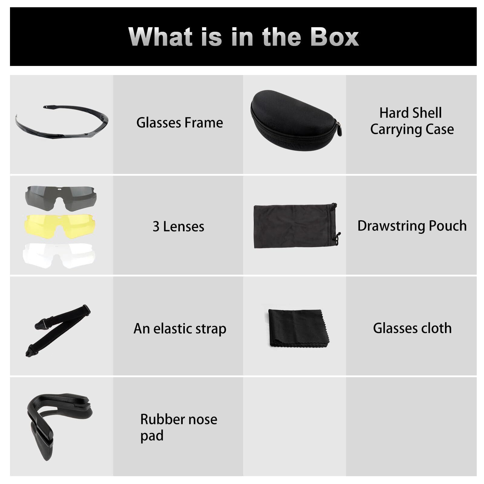 1. 2mm厚みの強化レンズ - 従来品とくらべてFOCUHUNTER-JPより改進されたシューティンググラスのレンズは厚みを強化しており、かなりの衝撃に耐えることができます。3種類のレンズがセットのため、シーンやフィールドに合わせてレンズを変更できます。耐衝撃コーティング+UV400タクティカルサングラス