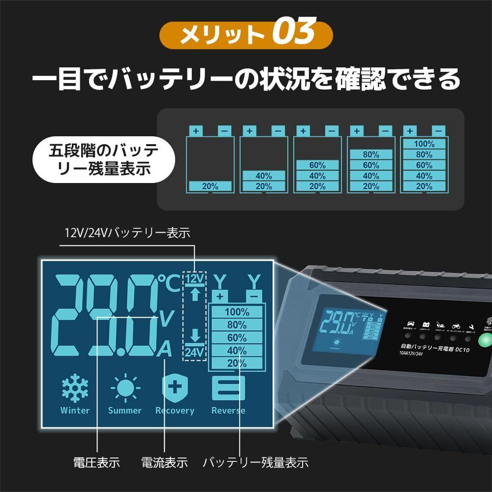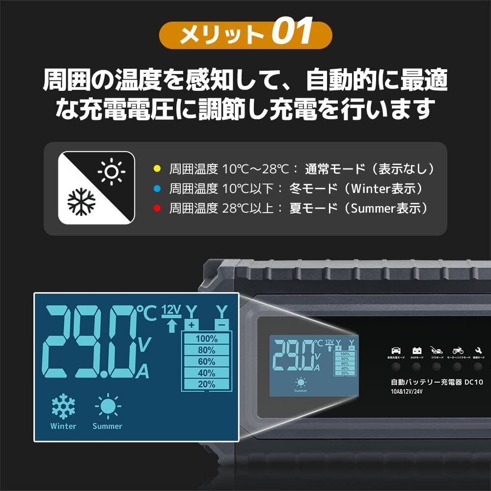 LVYUAN(リョクエン)自動「パルス充電」バッテリー充電器 定格10A 緊急時全自動 スマートチャージャー 12V/24V対応 バッテリー診断機能付 AGM/GEL車充電可能 バイク ・自動車・農機・建設機械・小型船舶など 日本語説明書 DC-10 温度感知モード 冬満充電を確保