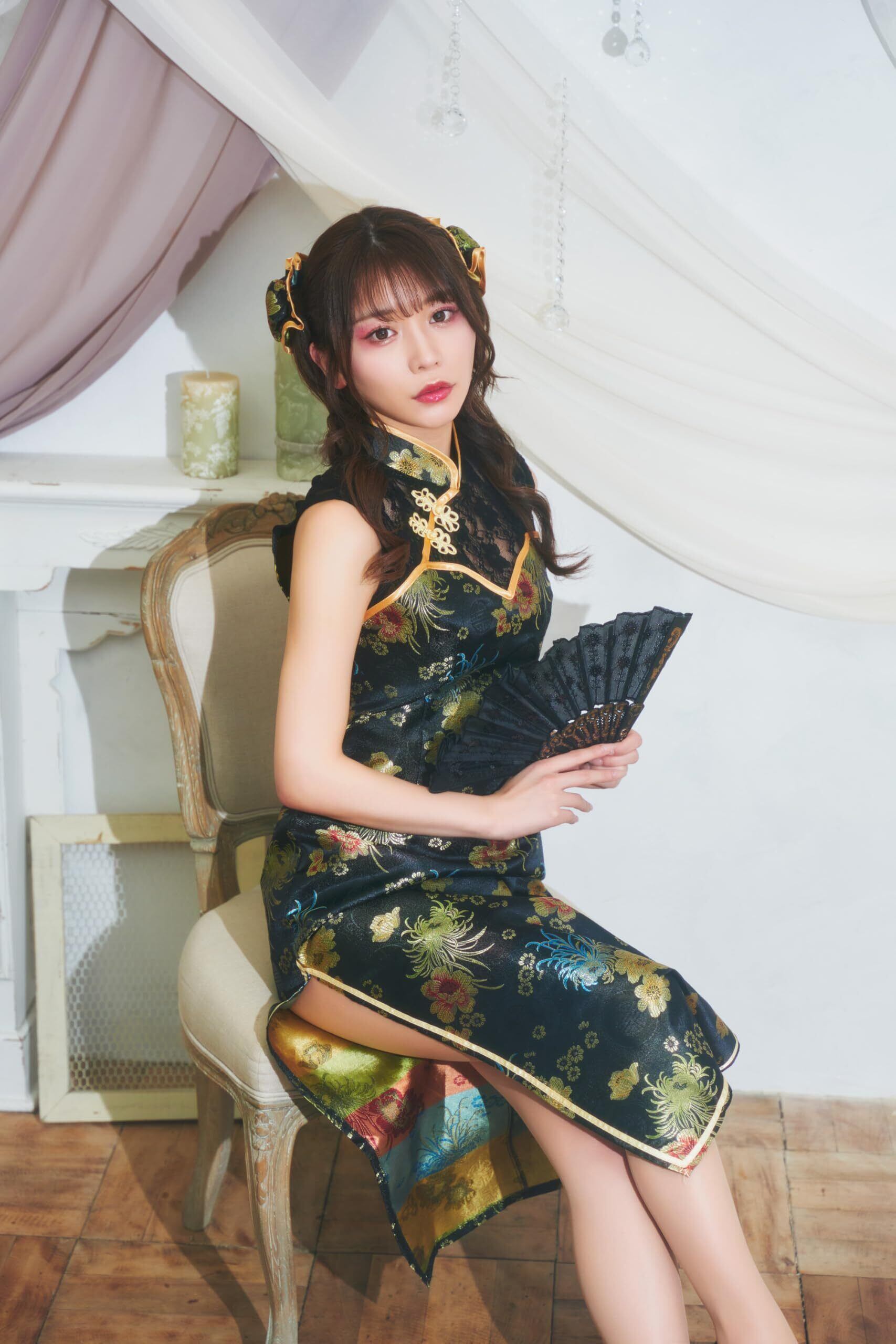 デコルテのレース切り替えがエレガントなロング丈のチャイナコスチューム。
