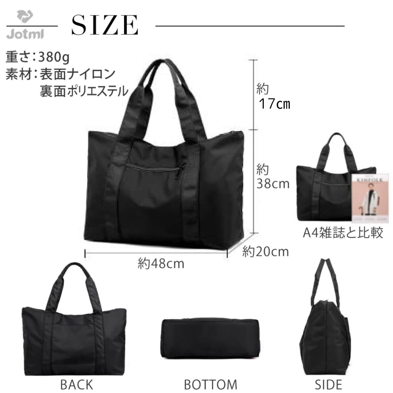 [Jotml] 6色 トート バッグ 大容量 ナイロン 2WAY 肩掛け 手提げ ユニセックス 防水