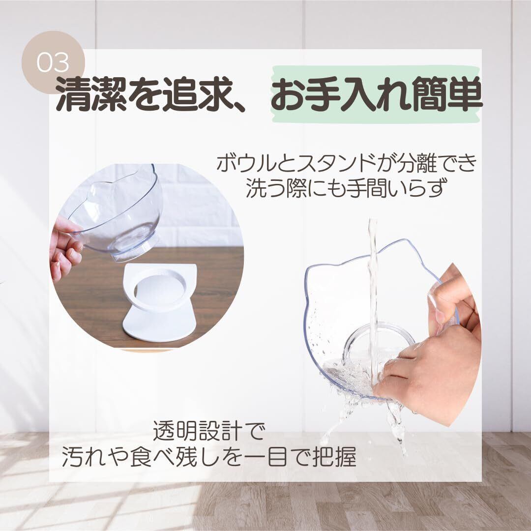 【清潔を追求、お手入れ簡単】毎日の使用に耐え、しかも簡単にお手入れできることは飼い主の皆様の大きな要望。当商品はシンプルなデザインでボウルとスタンドがしっかりと分かれているので、洗う際にも手間がかからず、いつでも清潔な状態を維持できます。特にボウルは透明設計なので、汚れや食べ残しが一目でわかります。