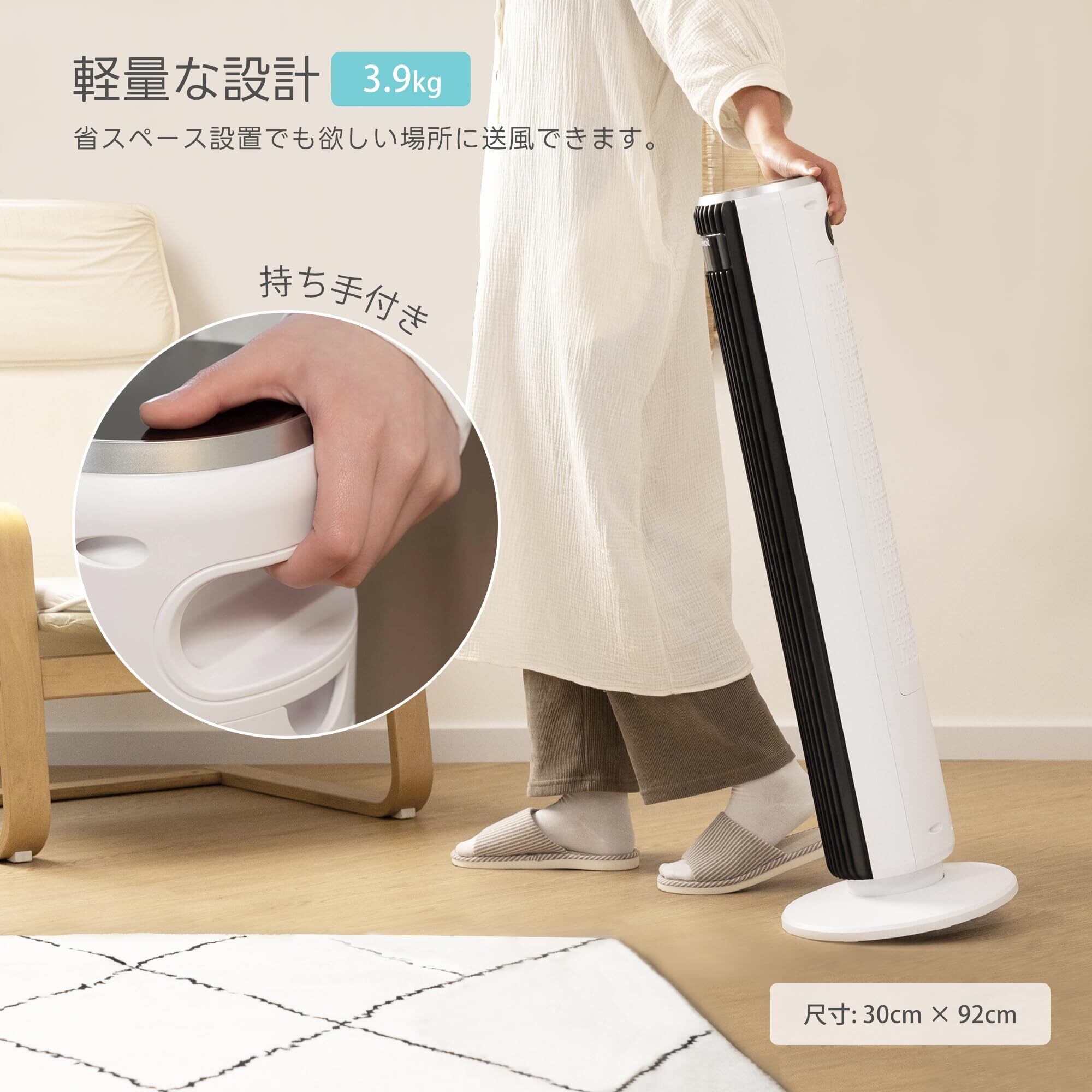 【省スペース】スタイリッシュなデザインで、羽がないので子供がいる家庭やペットを飼っている方にも適しています。リビングルーム、オフィス、寝室、ベッドルーム、キッチン、脱衣所、廊下やトイレなどにも設置することができます。●商品サイズ(cm):幅約30×奥行約30×高さ約92。●商品重量:約3.9kg