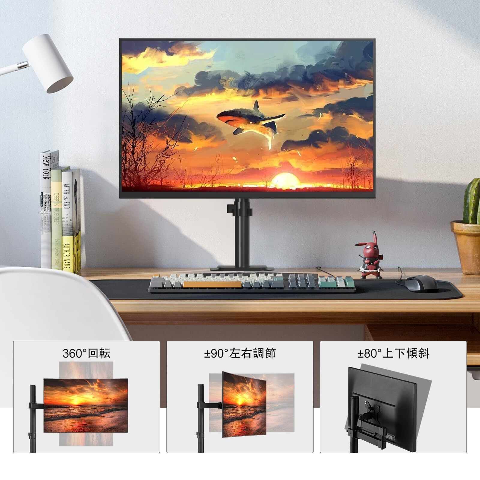 【ディスプレイ角度を自由に変えれる】①アーム:ポールの接続部分移動で高さ調節(406mm) ②VESAプレート部:上向き80°、下向き80°、回転360°、左右各90°。角度や距離などが自分に合って、前後左右に加えて上下も好みの位置に軽々と動かすことができます。ビジネスでの利用はもちろん、トレーダーやゲーマーの方にもおすすめです。 ご注意:付属の六角レンチでボルトを締めて傾斜角度を固定します。一方のモニターが低い場合は、ナットを取り外し、付属の六角レンチでボルトを反時計回りに回してモニターを上げます。調整後、ナットを取り付けます。