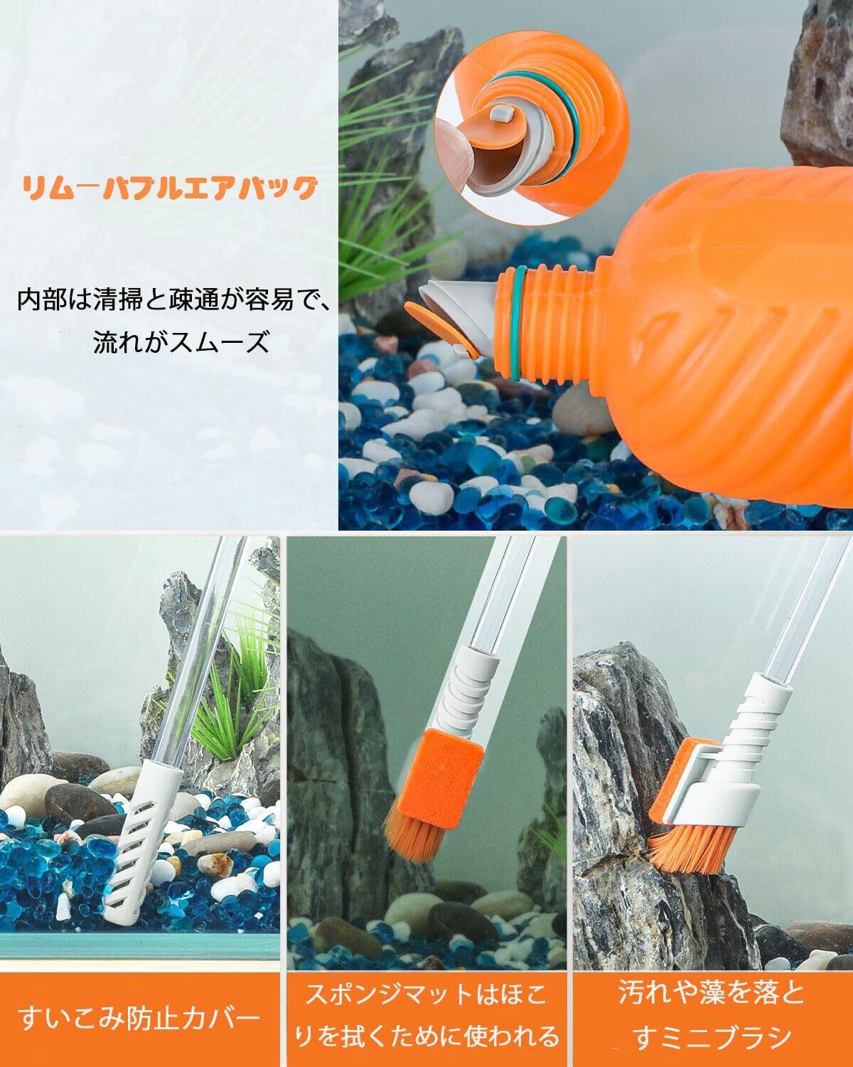 多機能水槽掃除ブラシ:吸水口保護カバーを備え、稚魚やエビが吸い取られるのを効果的に防止する。多機能クリーニングヘッドにはミニブラシとマットが付いている。排水時には、装飾拭き、汚れ、糞の除去、壁拭きに最適です。