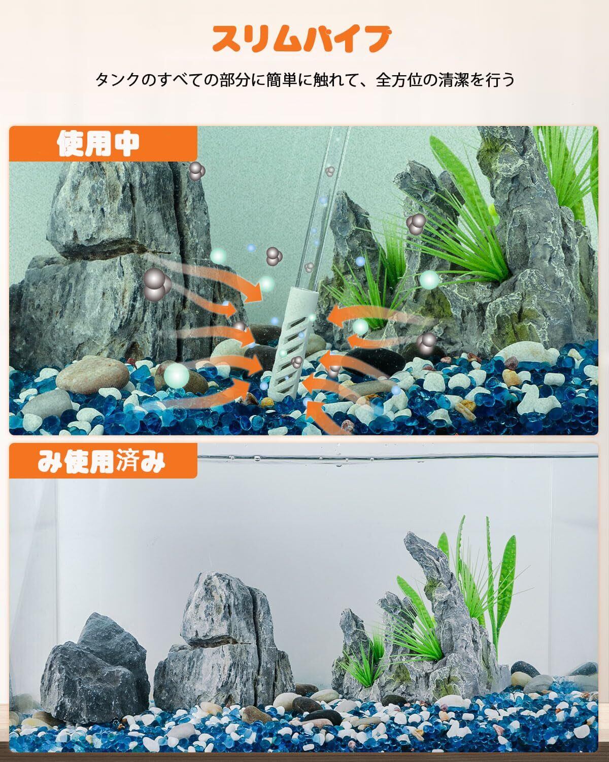 どこにでも簡単に到着:サイフォン掃除機のストローは非常に最適化され、より硬く、より細くなりました。岩や植物の間の隅々や隙間に簡単に到達します。水槽の各部分に素早く到達して全方位清掃を行う。