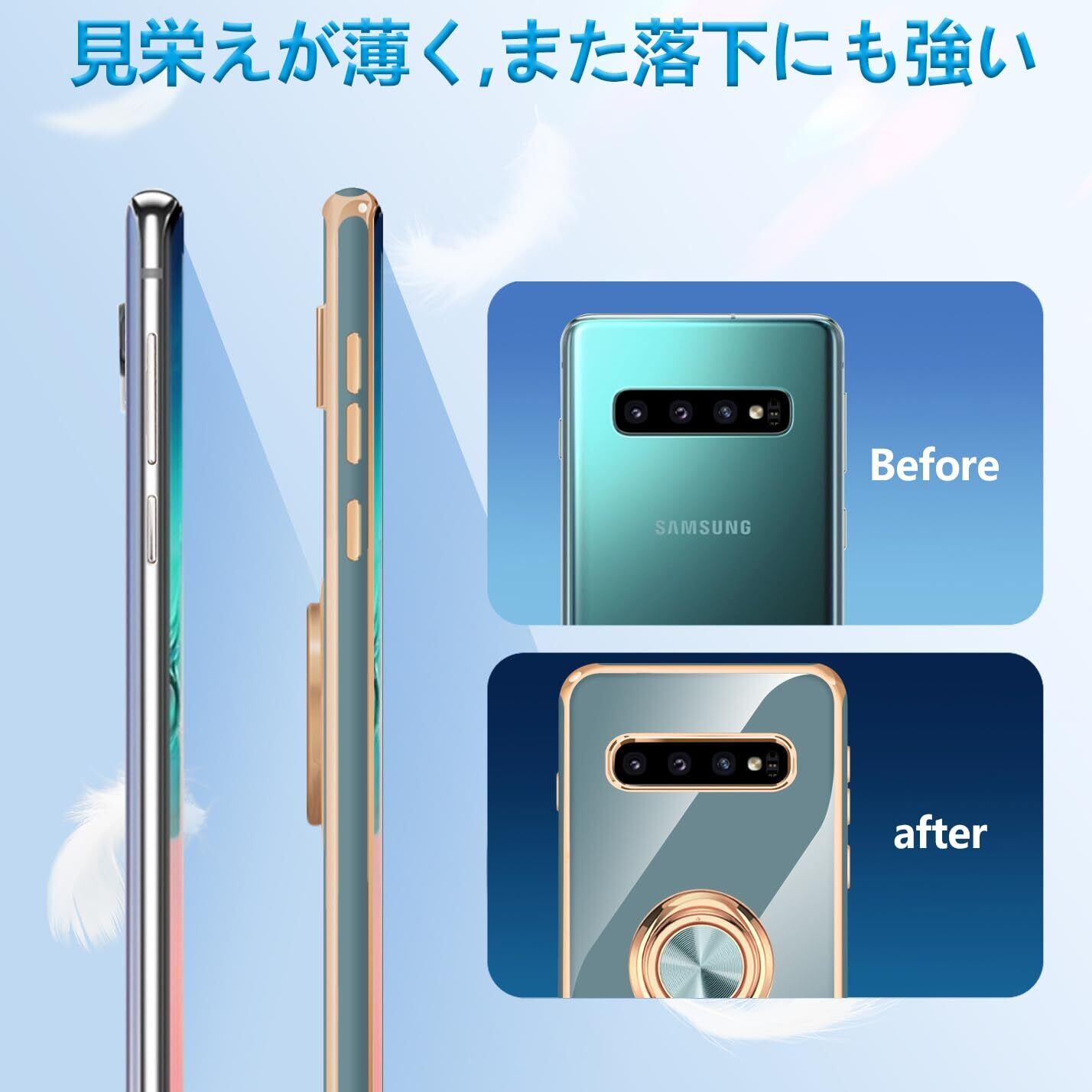 【ソフトマイクロファイバーライニング】ケースの内側はソフトマイクロファイバーで裏打ちされており、電話の背面に傷が付かないようになっています。柔らかい電気メッキシリコンフレーム+金属リングスタンドは、Galaxy S10の金属の質感を作ります。