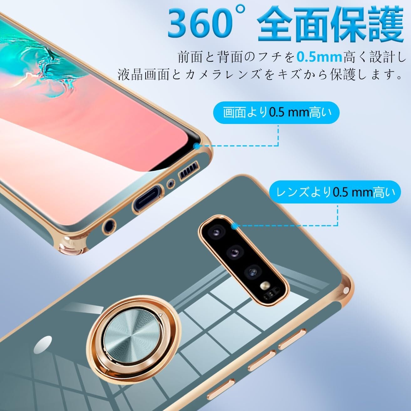 Galaxy S10 ケース リング付き SC-03L SCV41 ギャラクシーS10 リング カバー 耐衝撃 TPU 携帯カバー シリコン スタンド機能付き 360回転車載ホルダー(グレーブルー) | hananoki