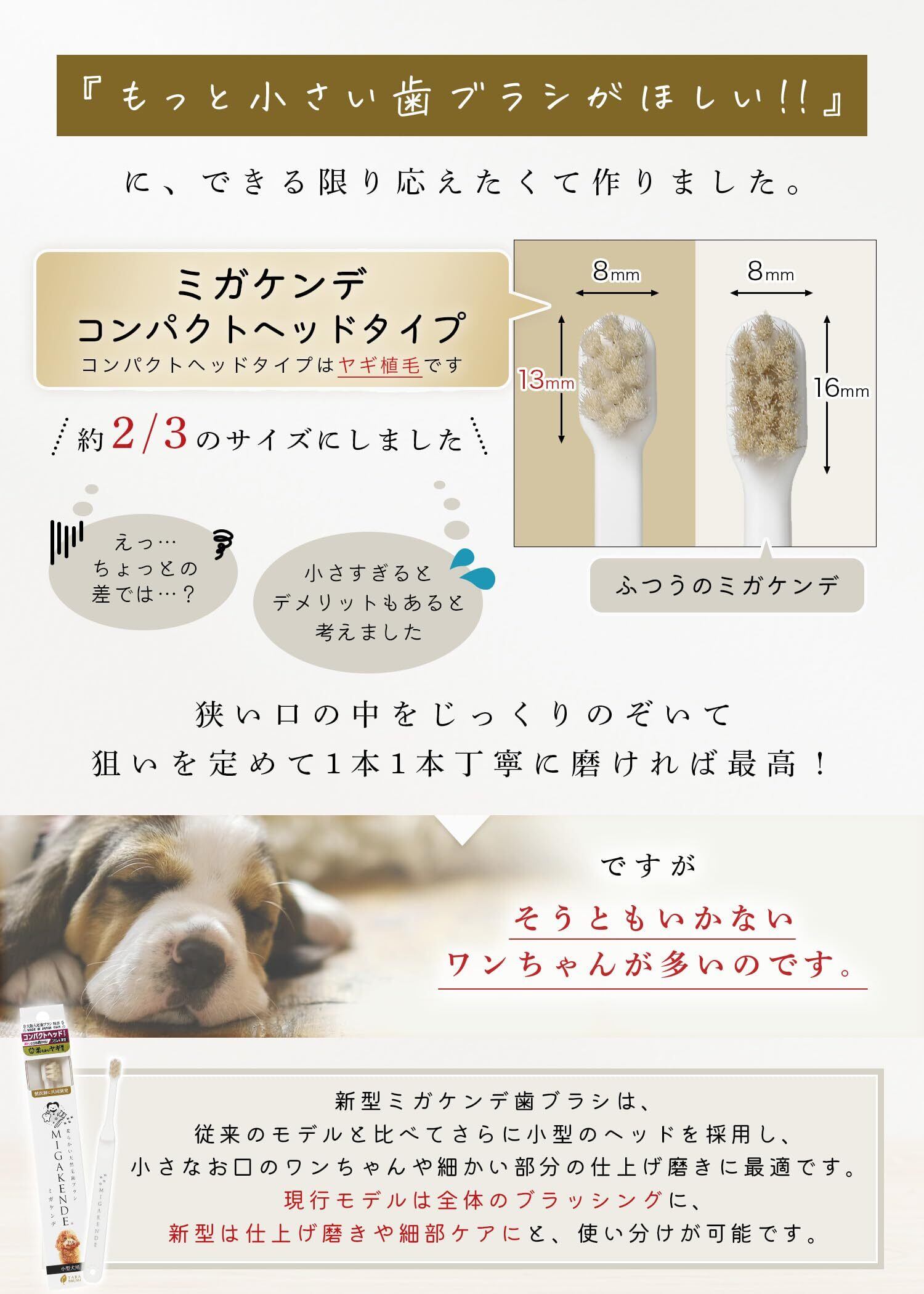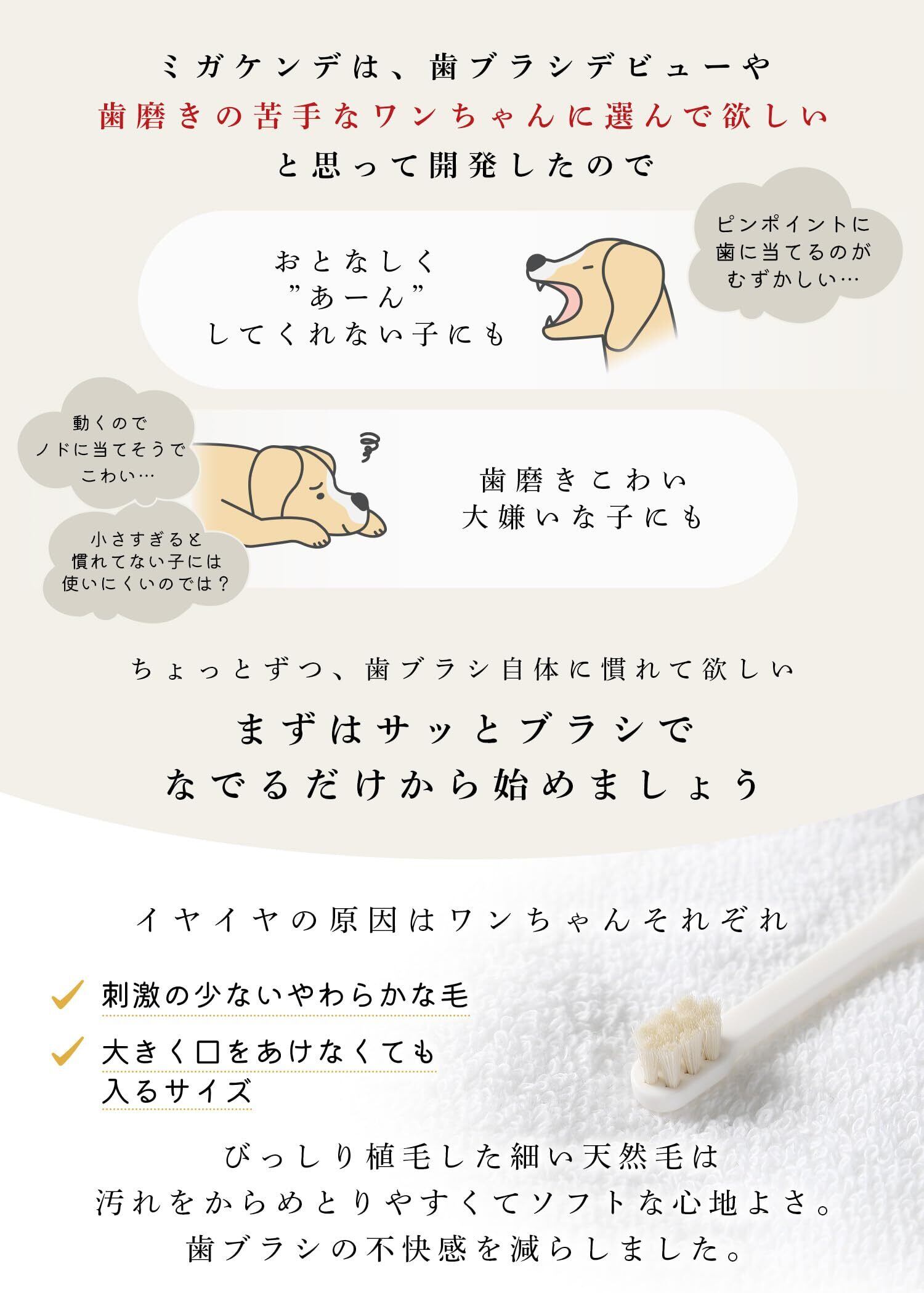 【獣医師と共同開発】ミガケンデは、歯ブラシの社長自身が愛犬の全身麻酔での抜歯を目の当たりにしたことがきっかけで開発されました。長年の製造ノウハウと獣医師のアドバイスを融合し、飼い主さんにとってもワンちゃんにとっても安全安心で、使いやすい犬用歯ブラシを作りました。歯磨きの際に歯ブラシを噛んでしまうことの多いペット用として、天然毛は『飲み込んでも安心』です。刺激が少なく歯と歯茎にとても優しいやわらかい素材ですが、しっかり歯垢がとれるよう従来の5〜10倍多く植毛しています。