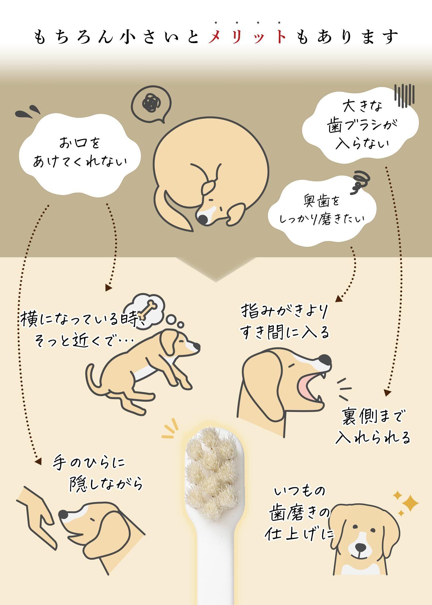 【コンパクトヘッド植毛】スリム&薄型のコンパクトヘッドを採用し、小さなお口のワンちゃんや細かい部分の仕上げ磨きに最適です。現行モデルは歯全体や歯茎のブラッシングに、新型は仕上げ磨きや細部ケアにと使い分けが可能です。ヤギ植毛(毛質タイプ:超やわらか)となります。コンパクトでも濃密な毛のボリューム感は維持しました。狭い口のワンちゃんにも対応しやすく、口を大きく開けなくても隅々まで磨けます。特に仕上げ磨きでは、細かい部分までしっかりケア歯ブラシが苦手なワンちゃんでも使いやすいように設計されています。犬が口を「アーン」と大きく開けてくれない場合でも、少しずつ慣れさせることができる設計です。