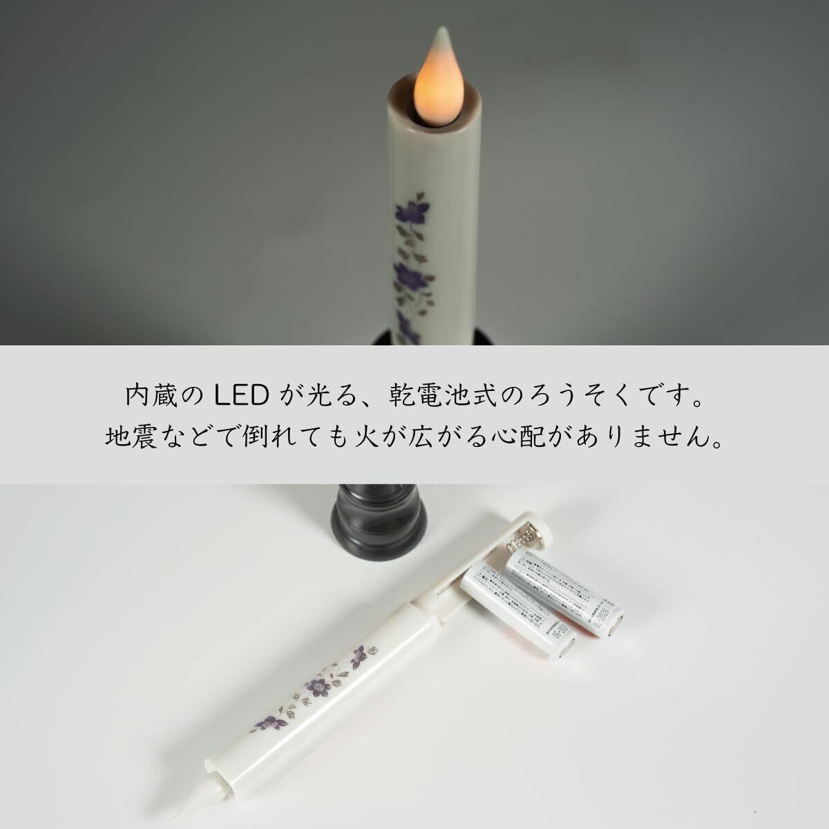 和ろうそくのような外観で、リビングに設置するタイプのステージ仏壇、ミニ仏壇、モダン仏具などのかわいい仏具にも合わせやすい大きさです。この蝋燭は灯を使わず、灯を使わず、煙も出ないため、小さなお子様やペットのいるご家庭でも使いやすい仏壇用品です。